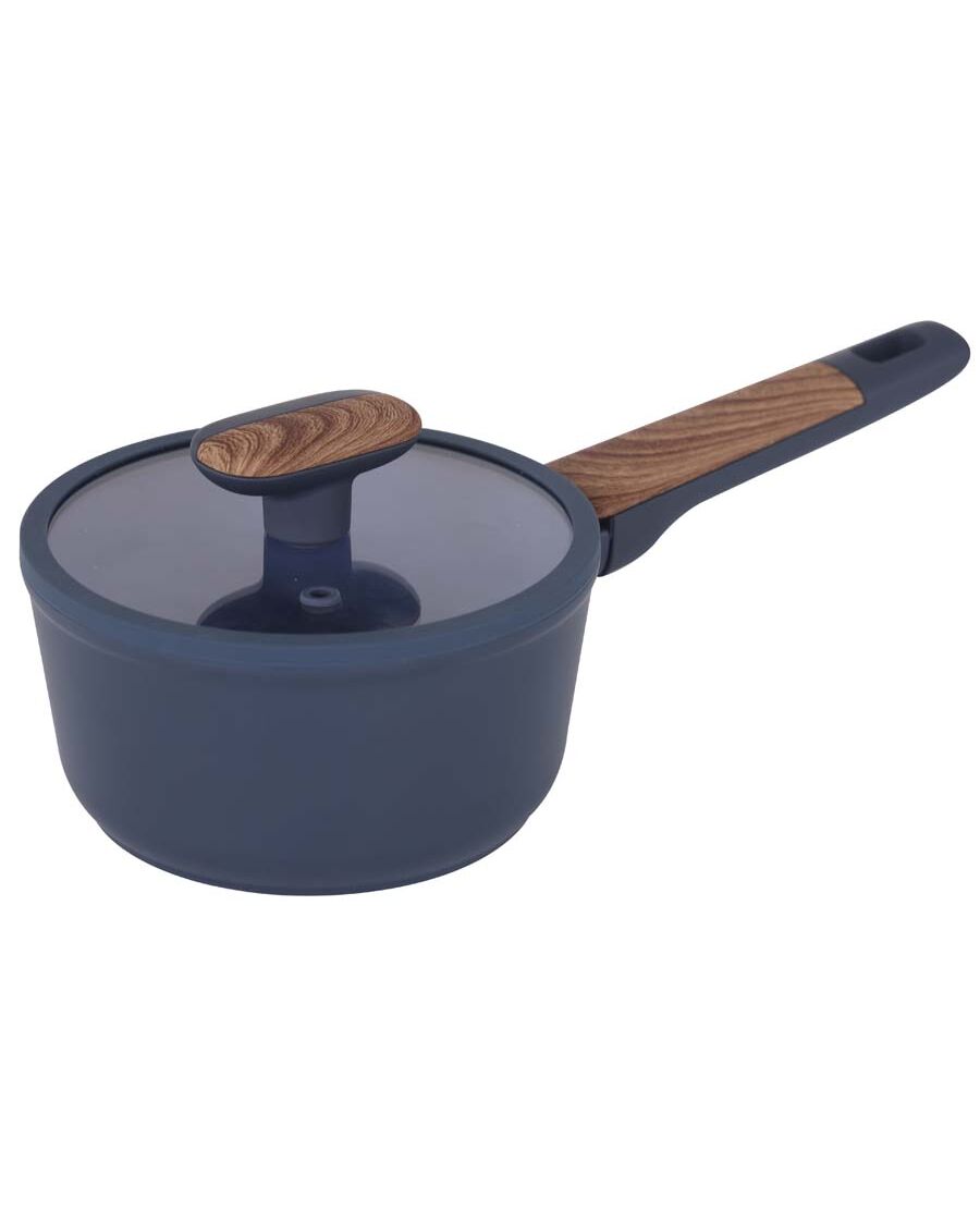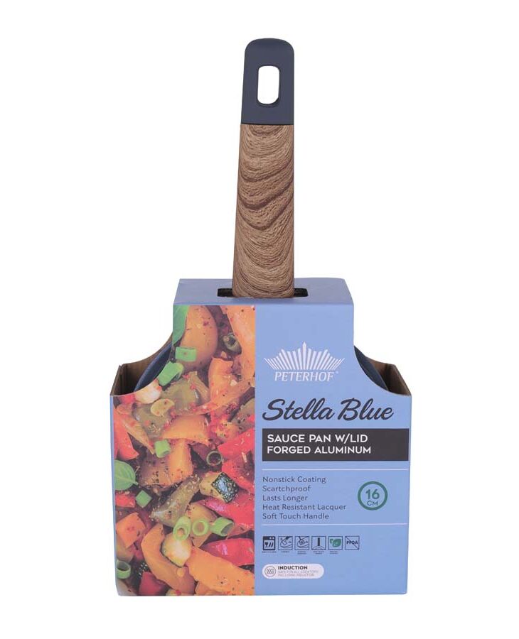 Касерола Peterhof Stella Blue 16 см, кован алуминий с незалепващо покритие и капак Внесете модерен стил и високо качество във вашата кухня с касеролата Peterhof Stella Blue с диаметър 16 см. Този компактен съд с дълга дръжка е идеален за приготвяне на сосове, кремове, попарване на малки количества зеленчуци, варене на мляко или индивидуални порции супа. Издръжливост и ефективност: Касеролата е изработена от кован алуминий (Forged Aluminum), който осигурява изключително бързо и равномерно загряване. Това я прави енергийно ефективна и перфектна за ястия, които изискват прецизен контрол на температурата. Съдът разполага с висококачествено незалепващо покритие (Nonstick Coating), което е устойчиво на надраскване (Scratchproof) и е създадено да трае по-дълго. Незалепващото покритие улеснява готвенето и почистването. Касеролата е подходяща за употреба на всички видове котлони, включително индукционни. Безопасност и контрол: Покритието на касеролата е напълно безопасно, тъй като е без PFOA (PFOA free), гарантирайки здравословно готвене. Съдът е снабден с термоустойчив лак (Heat Resistant Lacquer). В комплекта е включен стъклен капак, който позволява визуално следене на процеса на готвене и задържане на топлината и парата вътре. Комфорт и стил: Касеролата се отличава с наситен, матов син цвят (Stella Blue). Оборудвана е с дълга бакелитна дръжка с покритие "soft touch" (меко докосване). Дръжката е топлоустойчива, не се хлъзга и има елегантен дървесен десен, както и дръжката на капака. Този дизайн осигурява сигурен и удобен захват.