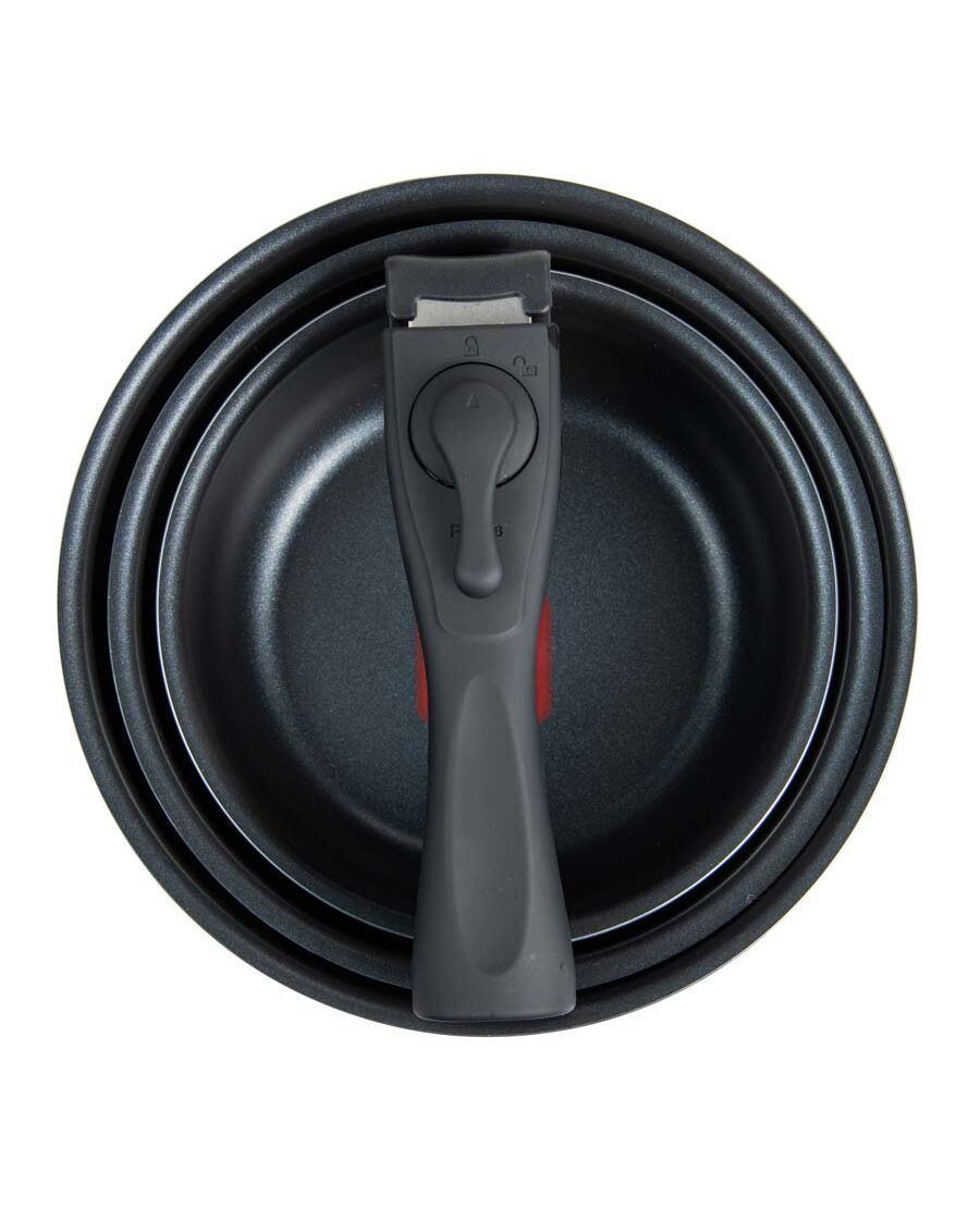 С комплекта касероли CLick&Cook (16, 18 и 20 см), Bergner предлага практично решение и множество възможности за ежедневно готвене на най-вкусните рецепти. Насладете се на модерно готвене без усилия с уникалния температурен индикатор Thermo spot, който променя цвета си до тъмночервено, когато съдът достигне оптималната температура за готвене. С тези касероли ще спестите много място в шкафа за съдове благодарение на подвижната дръжка, която пасва на всеки съд от серията. С едно щракване я поставяте здраво закрепена върху касеролата, а свалянето става по същия лесен начин само с една ръка. Без дръжка касеролите могат да се използват и във фурната за финално запичане на ястията. Касеролите са изработени от алуминий. Материалът абсорбира бързо и равномерно топлината, като по този начин получавате икономия на електроенергия. Касеролите са оборудвани с незалепващо покритие ILAG Essential, което гарантира, че храната не залепва и улеснява почистването.Елегантното черно покритие осигурява модерен и изискан вид, който пасва на всяка кухня. Касеролите са подходящи за всички видове готварски плотове, включително индукционни.