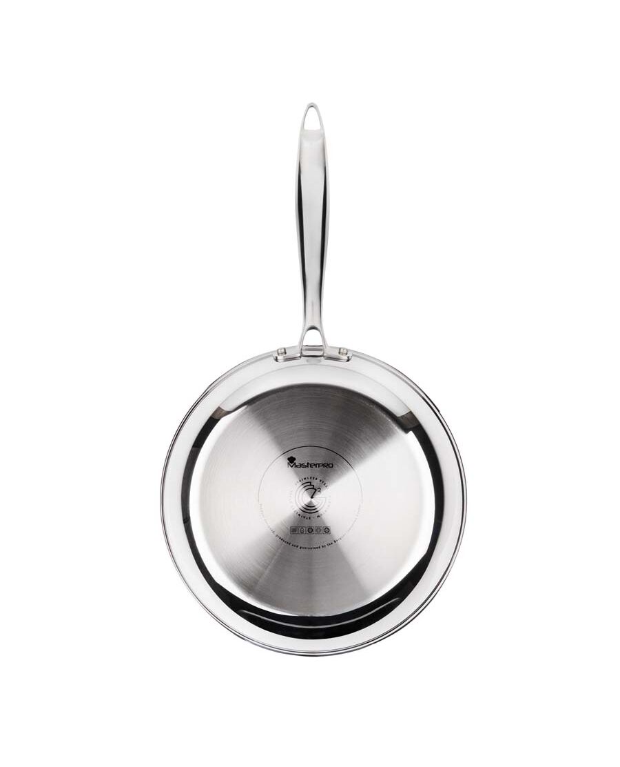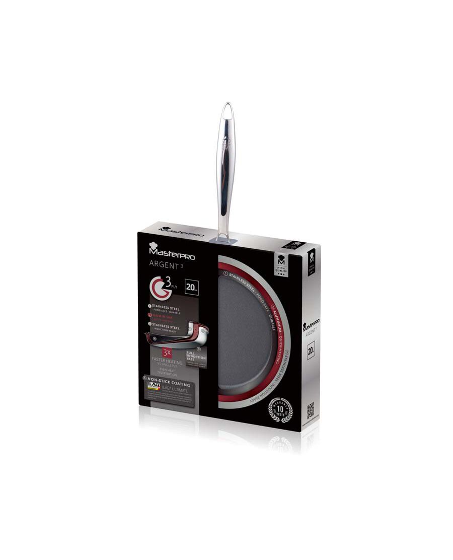 Висококачествен тиган от серията на Masterpro Argent. Тиганът е с трислойна структура (3-PLY). Горната част на съда е от неръждаема стомана 18/10, един от най-безопасните материали за контакт с храна - изключително здрав, издръжлив и неразрушим. Сърцевината на тигана е от алуминий - отличен проводник на топлина, който подобрява равномерното разпределение на топлината, повишава скоростта, с която се загрява тигана и същевременно намалява теглото му. Долната част на тигана също е от неръждаема стомана, която има магнитни свойства и това прави съда подходящ за всички видове котлони, включително индукционни. Вътрешната част на тигана е покрита с изключително издръжливо незалепващо покритие ILAG Ultimate (без PFOA и BPA) за лесно готвене с малко мазнина и безпроблемно почистване. Ергономичната дръжката на тигана не се нагрява при готвене, което я прави безопасна за работа.