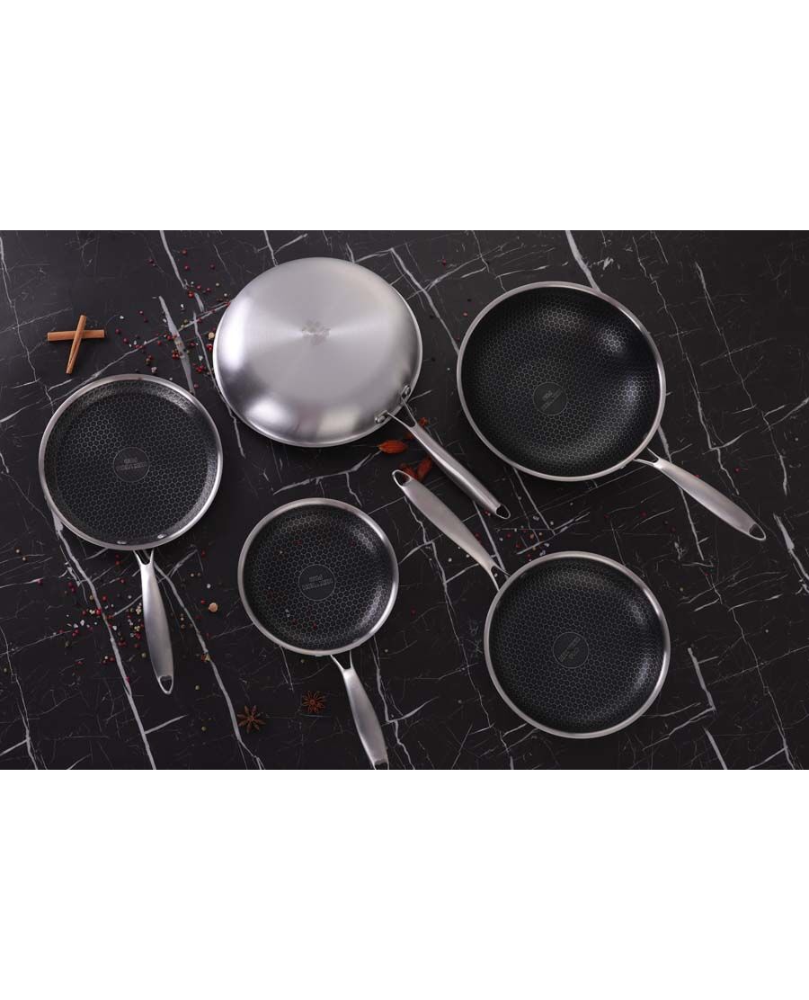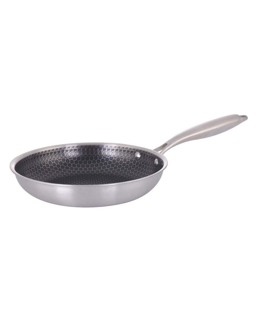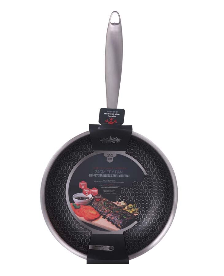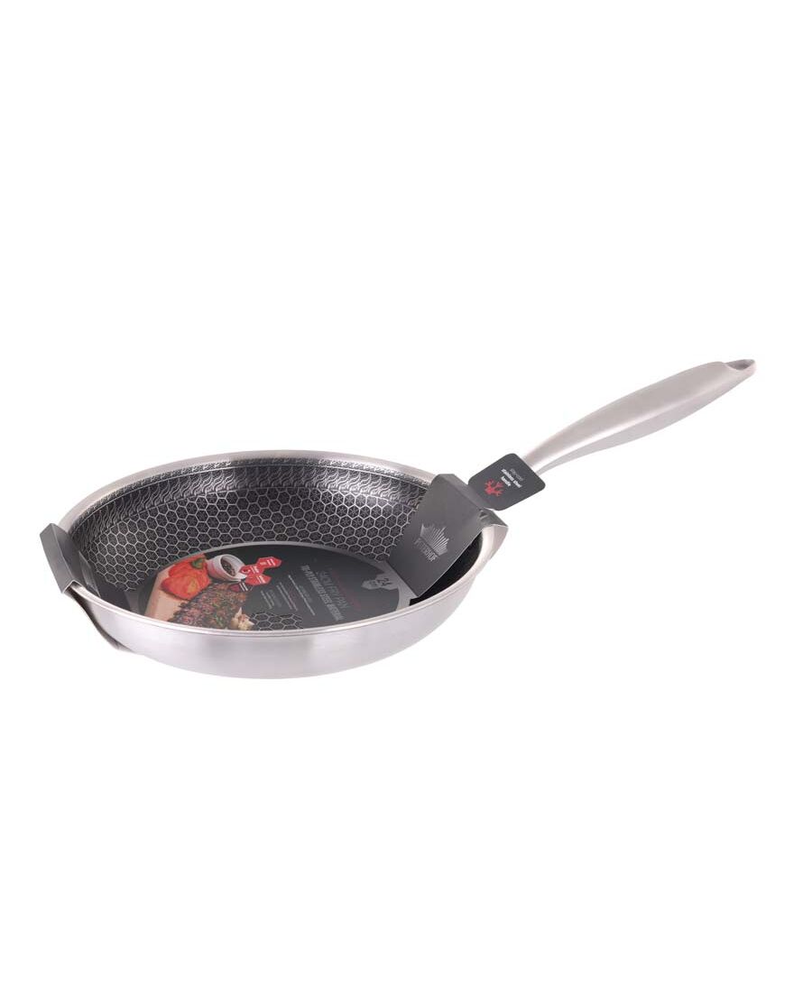 Тиган Peterhof hex-tech pro – революция в готвенето с tri-ply технология Влезте в бъдещето на кулинарното майсторство с тигана Peterhof Hex-Tech Pro. Този тиган е проектиран за професионална ефективност в домашната кухня, комбинирайки най-доброто от неръждаемата стомана и алуминия. С Tri-Ply конструкцията и иновативното незалепващо покритие тип пчелна пита, hex-tech pro гарантира равномерно и бързо готвене с минимално количество мазнина. Tri-ply технология за ненадмината издръжливост и ефективност Тиганът Peterhof hex-tech pro се отличава с високотехнологична Tri-Ply структура, която съчетава три различни слоя материал за оптимална производителност и устойчивост: Външен слой (дъно): Неръждаема стомана 403 – осигурява перфектна съвместимост с индукционни котлони и гарантира дълготрайна издръжливост. Сърцевина: Алуминий – разположен в средата, алуминият е отличен топлопроводник. Той осигурява изключително бързо загряване и равномерно разпределение на топлината по цялата повърхност на тигана, елиминирайки "горещите точки". Вътрешен слой: Неръждаема стомана 304 – този премиум клас неръждаема стомана (304) е изключително устойчив на корозия и осигурява безопасен и хигиеничен контакт с храната. Незалепващо покритие тип пчелна пита (hex-tech) Ключовата характеристика на тигана е иновативното незалепващо покритие тип пчелна пита (Hex-Tech). Това уникално покритие е гравирано в решетка от неръждаема стомана, което осигурява двойна защита: Издръжливост: металната мрежа защитава незалепващата повърхност от драскотини и износване, дори при използване на метални прибори. Незалепващ ефект: Незалепващият материал вграден във всяка "клетка" на пчелната пита гарантира, че храната не залепва, което прави почистването изключително лесно. Дизайн, удобство и практичност Peterhof Hex-Tech Pro е проектиран за удобство и безопасност при готвене. Stay-cool дръжка: Тиганът е снабден с куха метална дръжка със stay-cool дизайн. Тя остава хладна на допир по време на готвене, осигурявайки сигурен и комфортен захват. Универсалност: благодарение на индукционното дъно от неръждаема стомана, тиганът е съвместим с всички видове котлони – индукционни, керамични, газови и електрически. Може да се използва и във фурна. Размер: диаметърът от 24 см го прави идеален за ежедневно готвене за 2 до 4 души. Подходящ е за пържене на месо, риба, както и за приготвяне на по-големи омлети и палачинки. Инвестирайте в тиган Peterhof Hex-Tech Pro и се насладете на професионално качество, бързо готвене и дълготрайна устойчивост във вашата кухня!