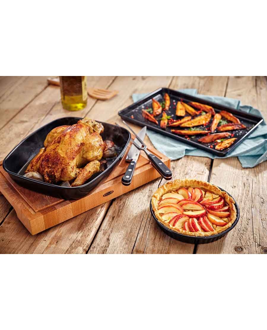 Тава за печене произведена от висококачествена стомана с твърди валцувани ръбове за здравина и безопасност.Всички повърхности са с двуслойно незалепващо покритие, лесно за почистване и с голяма издръжливост.