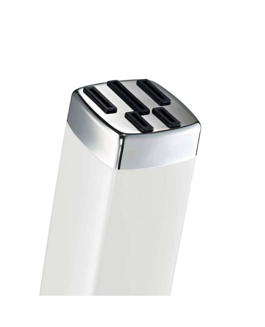Супер стабилен блок за ножове, подходящ за 5 стандартни домакински ножа. Блокът е изработен от комбинацията на материали - неръждаема стомана и цветен лак. Допълнителни тежести са закрепени така, че тежестта пада в задната част на блока за да се гарантира максимална стабилност. ВНИМАНИЕ: Ножове не са включени