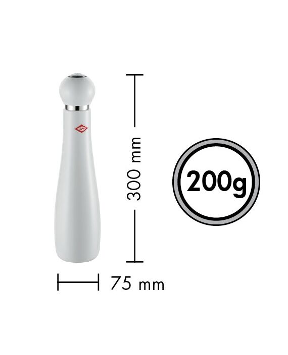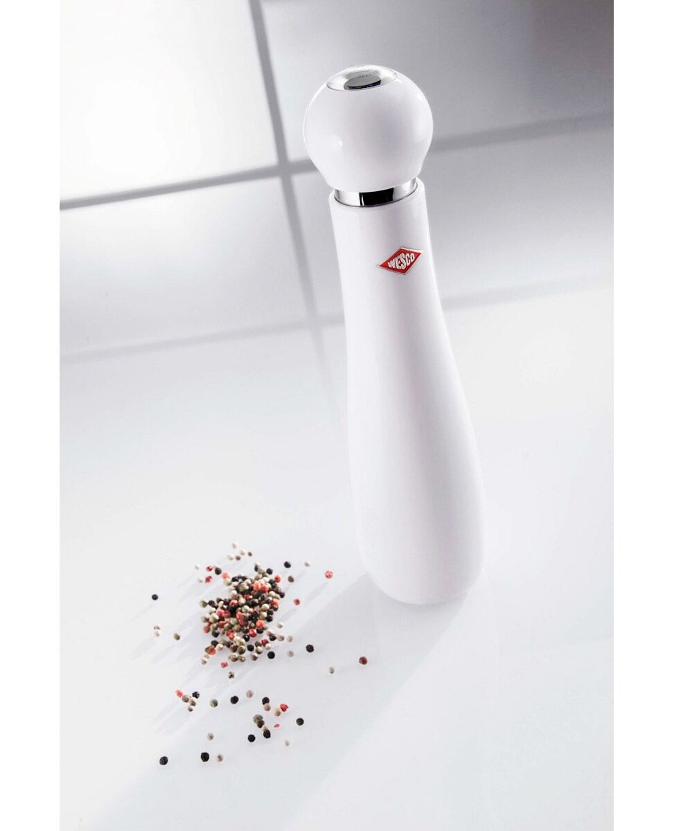 Новата весела мелничка на Wesco разполага с механизъм, който осигурява хигиенична употреба и защита от влага. Може да я заредите много лесно с отвиване на кръглата част на върха, подходяща е за смилане на сол, пипер, сушени билки, смеси подправки и други. Мелничката Peppy е оборудвана с висококачествен керамичен механизъм за смилане. Механизмът за смилане CrushGrind® е изработен от изключително здрава високотехнологична керамика - материал, който е по-твърд от стоманата. Почиства се лесно, и разполага с регулиращо колело за по-ситно или по-едро смилане на подправките. Мелницата и нейните компоненти не са подходящи за съдомиялна машина!