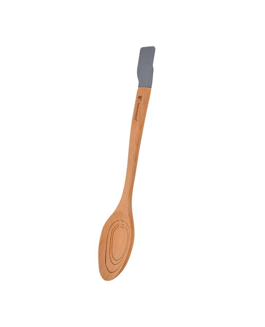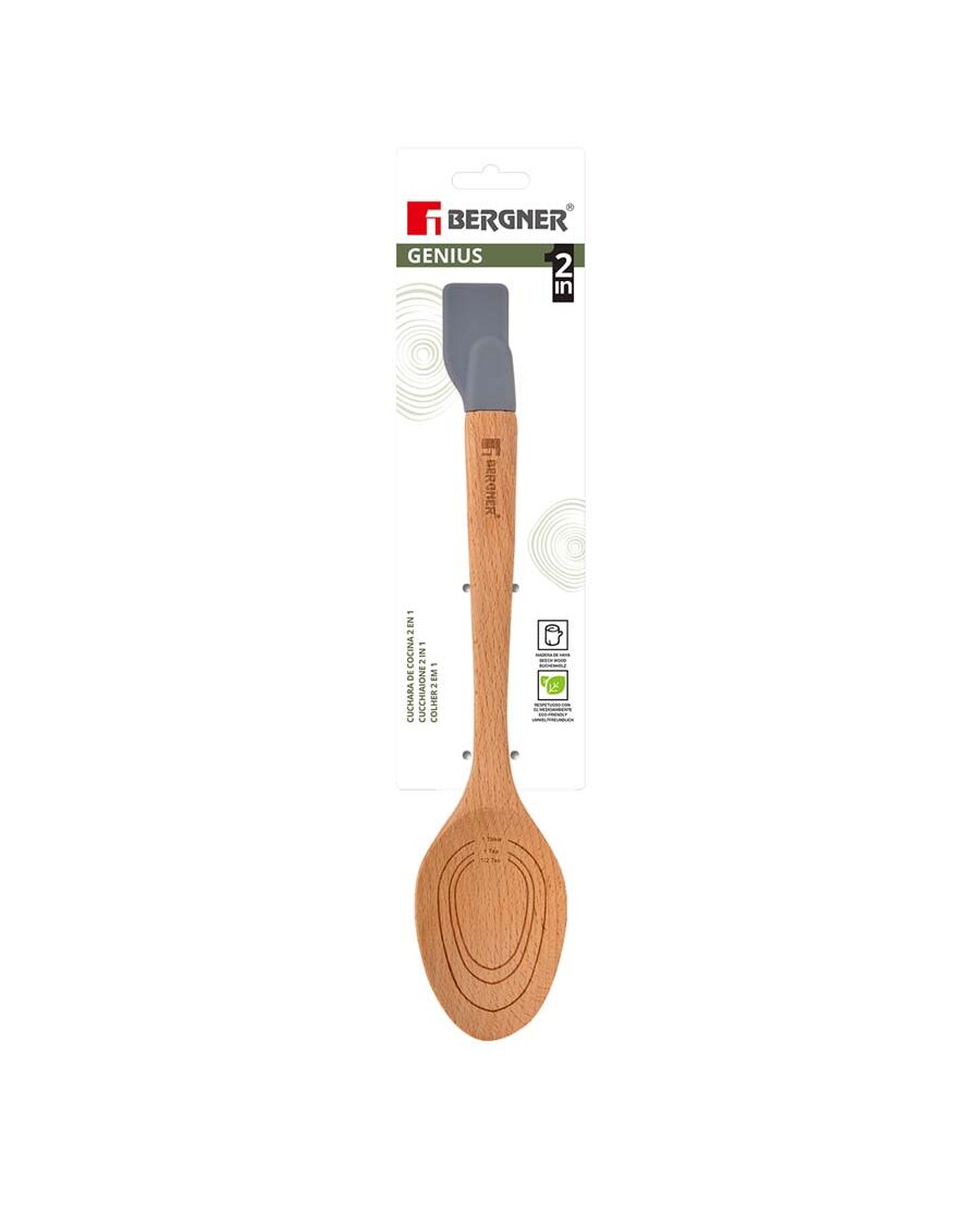 Многофункционална лъжица с дръжка шпатула, подходяща за разбиване, разбъркване, смесване и обиране. Лъжицата е разграфена с мерки за 1 супена лъжица, 1 чаена лъжичка и 1/2 чаена лъжичка. Изработена от брезова дървесина, препоръчва се ръчно измиване.