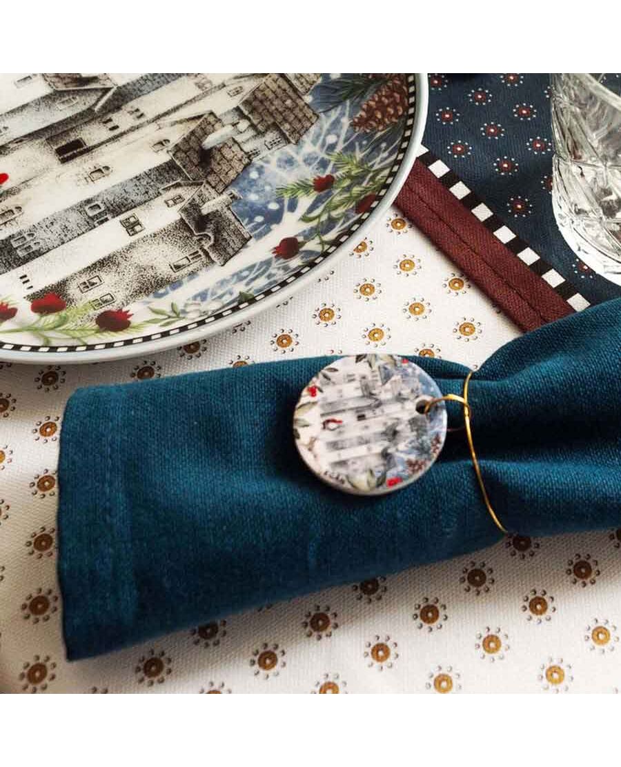Украсете трапезата си с елегантност и коледен дух с комплекта от 6 пръстена за салфетки с емблематични празнични герои като Дядо Коледа и Лешникотрошачката. Всеки пръстен е внимателно декориран за създаване на празнична и приветлива атмосфера по време на коледни обеди и вечери. Характеристики: Дизайн: Шест различни коледни и зимни герои и идилични сцени като Дядо Коледа, Лешникотрошачката, снежен човек, снежен град Материал: Висококачествена глазирана керамика, с елегантно златисто покритие на металната част. Цел: Идеално допълнение за коледната маса, подходящи за семейни събирания и празнични вечери. Тези пръстени не само че ще подчертаят красотата на вашето празнично оформление, но и ще добавят атмосфера на веселие и радост на всяко празненство. Създайте незабравими спомени с вашите близки, като използвате този коледен комплект!