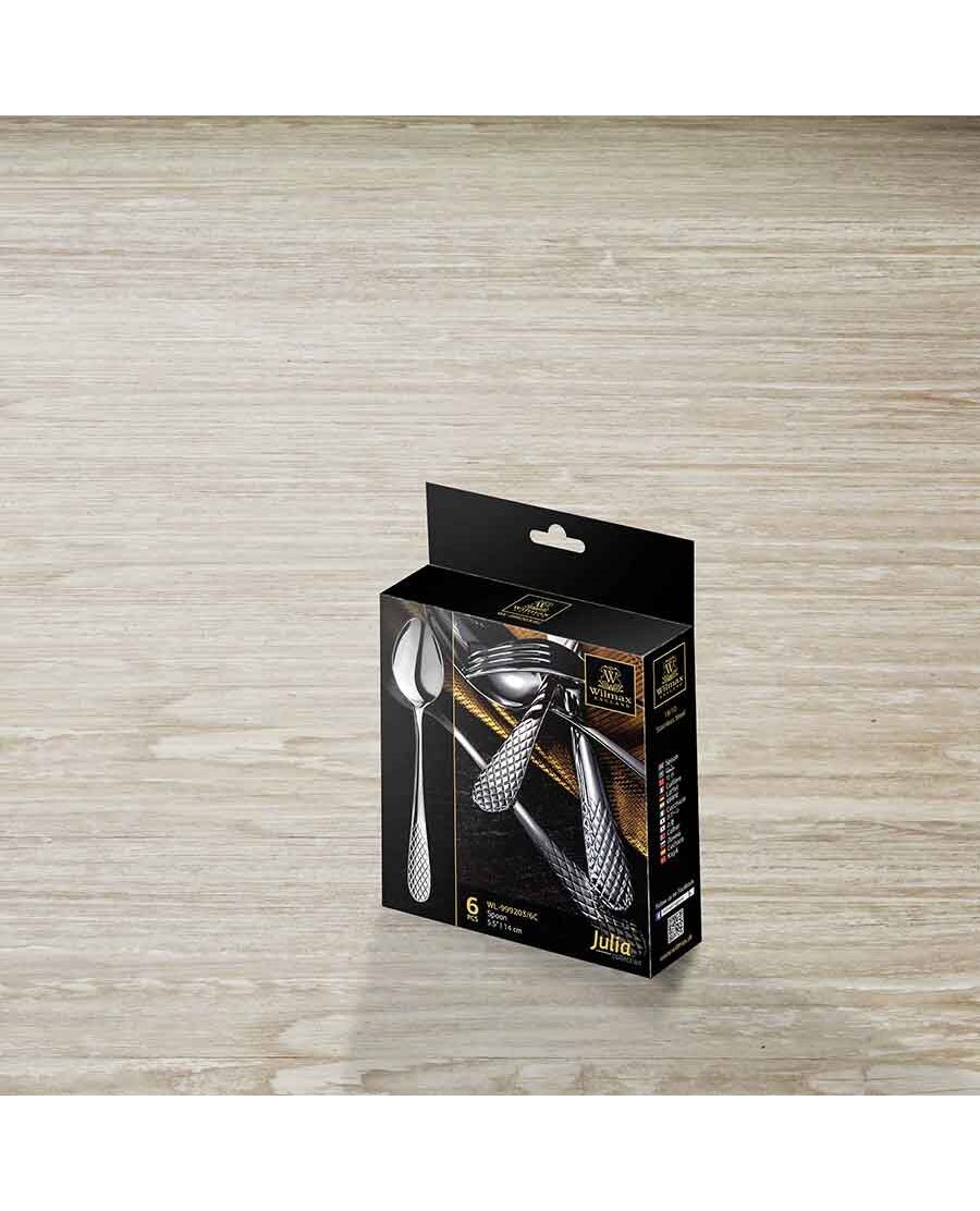 Комплект лъжички за чай от колекцията Julia Wilmax. Всички продукти от колекцията Julia имат отличителен релефен дизайн, изглеждат чудесно на масата и са подходящи както за ежедневни, така и за празнични поводи. Приборите за хранене Wilmax при сервиране допълват перфектно продукти от порцелан и бамбук. Приборите за хранене Wilmax са много приятни за използване, прилягат удобно в ръката благодарение на перфектно балансираните дръжки. А също така са красиви и изискани. Приборите за хранене на Wilmax са издръжливи, безопасни, лесни за почистване, като същевременно запазват ярък и привлекателен външен вид и могат да се мият и в съдомиялна машина.С приборите за хранене на Wilmax можете да сервирате ястия като в ресторант! Всички прибори за хранене на Wilmax са изработени от висококачествена неръждаема стомана 18/10 и са опаковани в красива подаръчна кутия, което ги прави идеална идея за подрък.