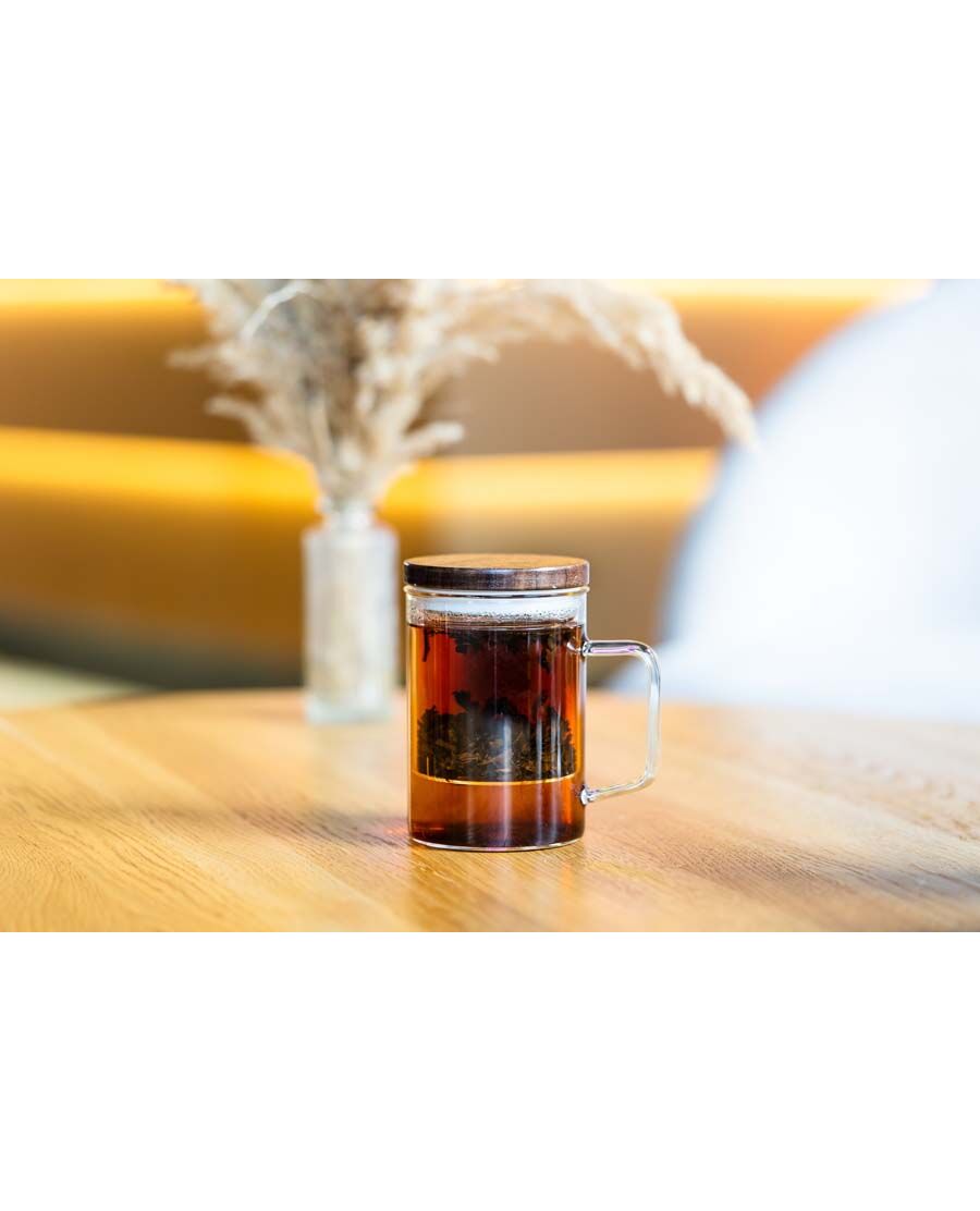Функционална чаша с инфузер от серията Soho на Vialli Design ще ви позволи да се насладите на любимия си чай, и то не само през зимните вечери. Продуктът е много лесен за използване, просто изсипете чаени листа в контейнера и след няколко минути можете да се насладите на перфектно запарен чай. Прозрачните стъклени стени дават възможност да се проследи процесът на запарване и да се контролира интензитета на чая.Чашата е изработена от боросиликатно стъкло, което е силно устойчиво на температурни промени, също и на потъмняване дори при интензивна употреба.Ергономичната форма на чашата и удобната дръжка гарантират, че тя стои сигурно в ръката ви и няма опасност от изплъзване.Чашата има специално оформен капак от орехово дърво и неръждаема, който обърнат наобратно може да се използва и като поставка, върху която да се постави инфузера.
