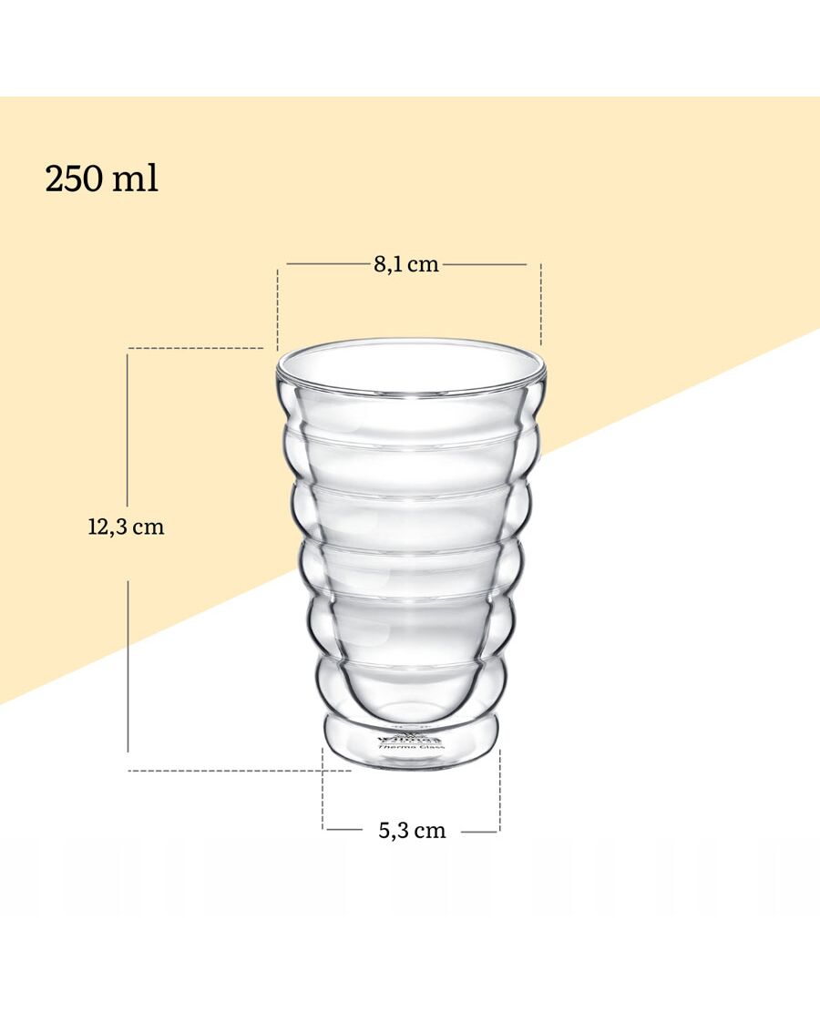 Тази термоустойчива стъклена чаша е идеалният избор за всеки, който цени елегантността и практичността. Капацитетът ѝ от 250 мл я прави идеална за сутрешно кафе или вечерна напитка. Изработена е от най-висококачествени материали, което гарантира дълготрайна употреба. Двойните стени на чашата поддържат температурата на напитката и не изгарят ръцете ви. Със сигурност чашите са с оригинална форма и напитките висящи сякаш във въздуха изглеждат феноменално в нея. Продуктите ThermoGlass WILMAX издържат на високи температури, хигиенични са, не абсорбират миризми и са много устойчиви на драскотини и счупвания.
