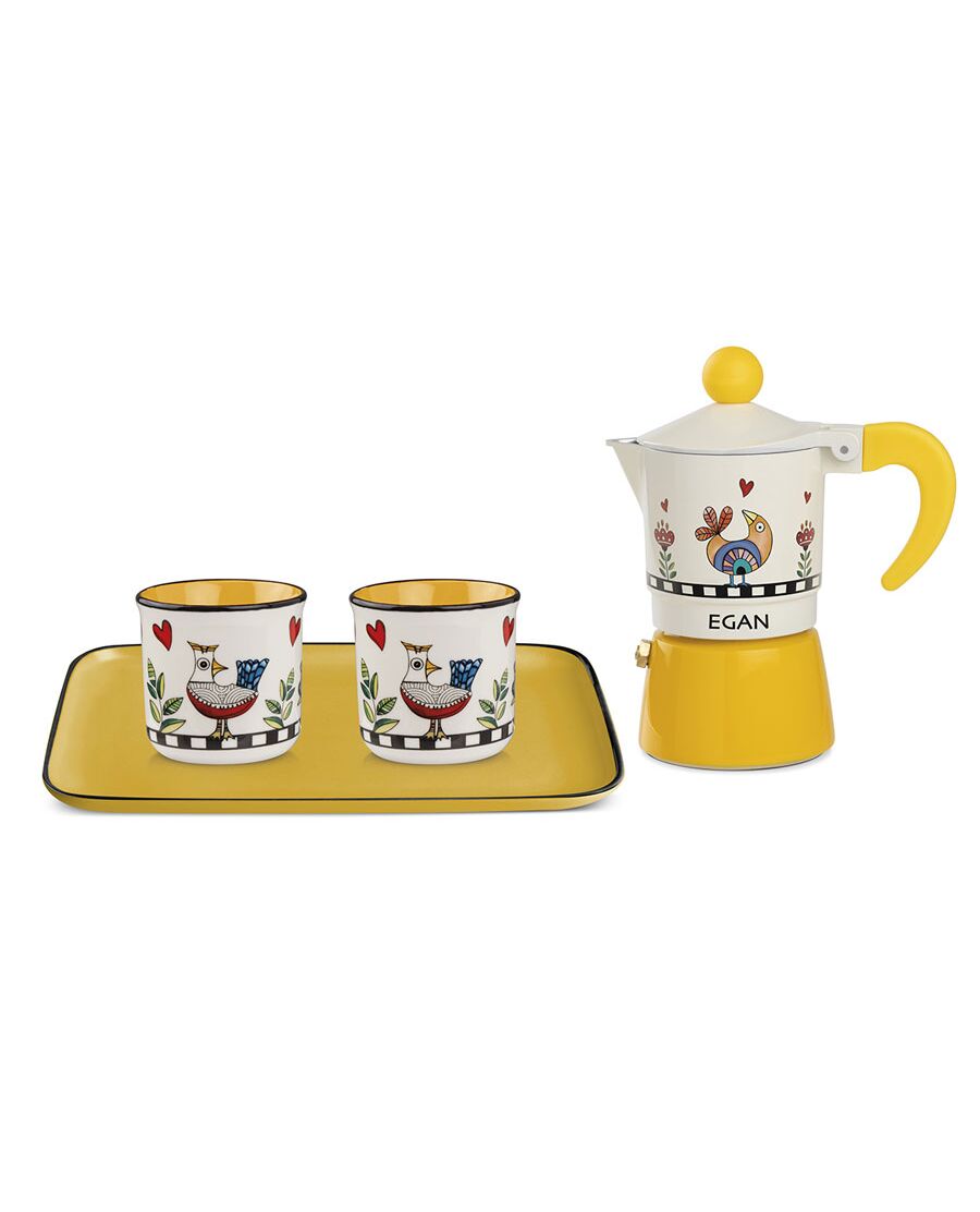 Комплект кафеварка Moka, чаши за кафе и табла, Egan Cocorico, жълти