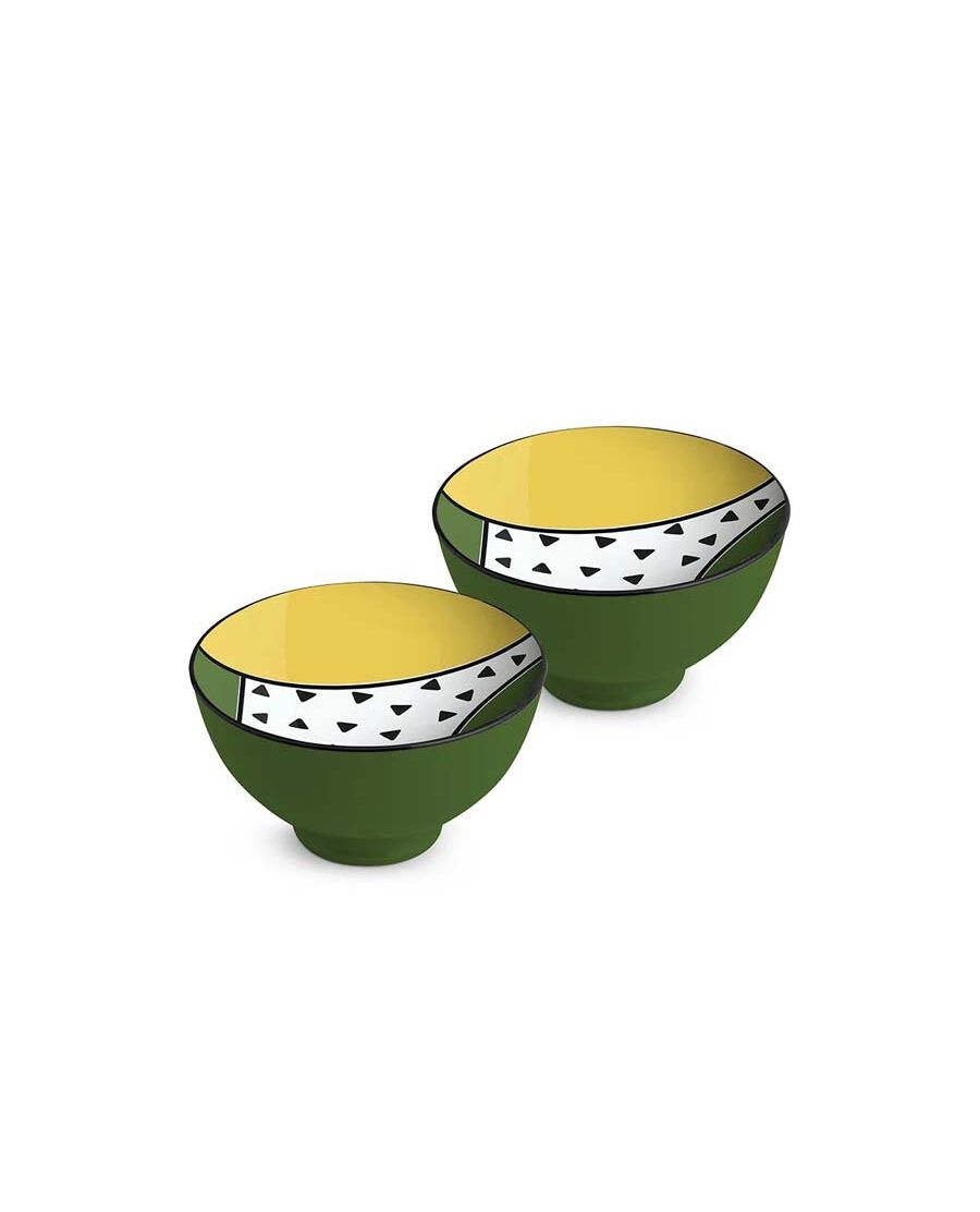 Комплектът от 2 купички Egan Wara с диаметър 11 см е изработен от керамика и предлага стилно и практично решение за сервиране. Купичките са в свеж зелен цвят, а вътрешната им част е в ярък жълт нюанс, което създава контраст и привлекателен вид. Декорацията включва уникални графични елементи, с флорални мотиви и черни триъгълни шарки, които добавят динамика към дизайна. Те са идеални за сервиране на предястия, сосове, ядки или сладки изкушения, прекрасно допълвайки всяка маса. Керамиката осигурява здравина и лесна поддръжка, а компактният размер ги прави подходящи за ежедневна употреба или специални поводи. Комплектът Egan Wara е отличен избор за всеки, който търси елегантност и практичност в кухнята.