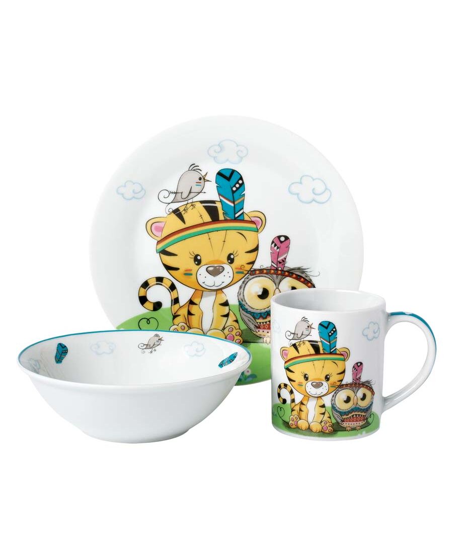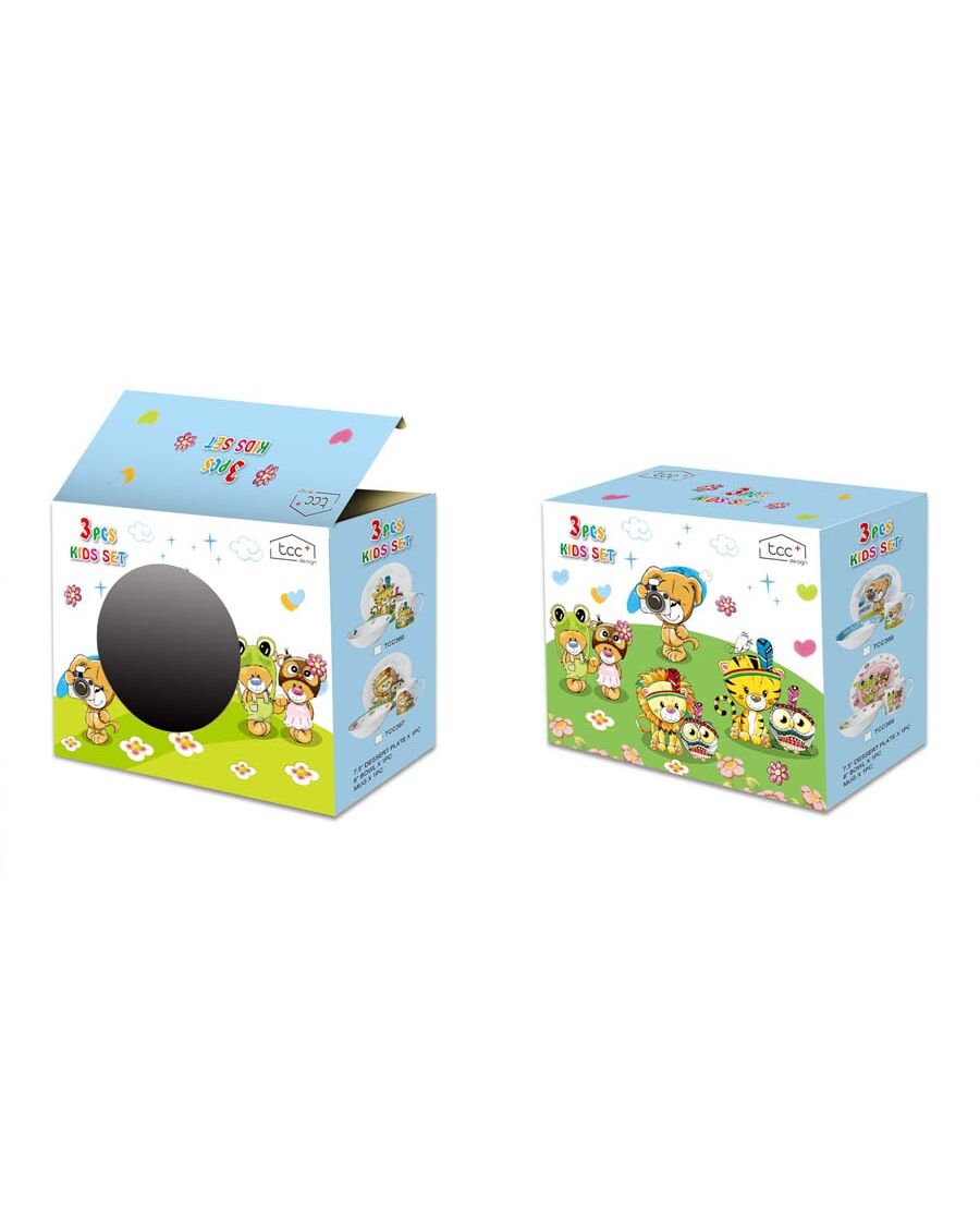 Детски сервиз за хранене 3 части – Забавно и безопасно хранене Превърнете храненето в приключение с детския сервиз 3 части от порцелан. Този комплект е идеален за малките членове на семейството, като комбинира практичност и забавен дизайн. Със своите атрактивни герои и висококачествен порцелан, той е перфектният подарък за всяко дете. Безопасен материал и забавен дизайн Сервизът е изработен от порцелан, който е безопасен и устойчив на топлина. Материал: Порцеланът е здрав и лесен за почистване, подходящ за ежедневна употреба. Дизайн: Комплектът се отличава с весели детски щампи с тигърче и бухалче, облечени като индианци с пера и шапки. Ярките цветове и забавните герои стимулират апетита на децата и правят храненето по-приятно. Безопасност: Материалът е безопасен за контакт с храна. Пълен комплект за детската трапеза Комплектът включва три основни части, специално проектирани за детски ръце и порции. Комплектът включва: Детска чиния: Идеална за основно ястие или сандвич. Детска купа: Перфектна за супа, зърнена закуска или десерт. Детска чаша: С удобна дръжка за лесно хващане, подходяща за мляко, сок или чай. Удобство при употреба и почистване Детският сервиз е практичен и удобен за ежедневна употреба от малки деца. Размер: Размерите на съдовете са оптимални за детски порции. Почистване: Порцеланът е лесен за миене и почистване, подходящ за съдомиялна машина (препоръчва се използване на по-ниски температури, за да се запази щампата). Подарете на вашето дете радост и стимул за самостоятелно хранене с този прекрасен детски сервиз!