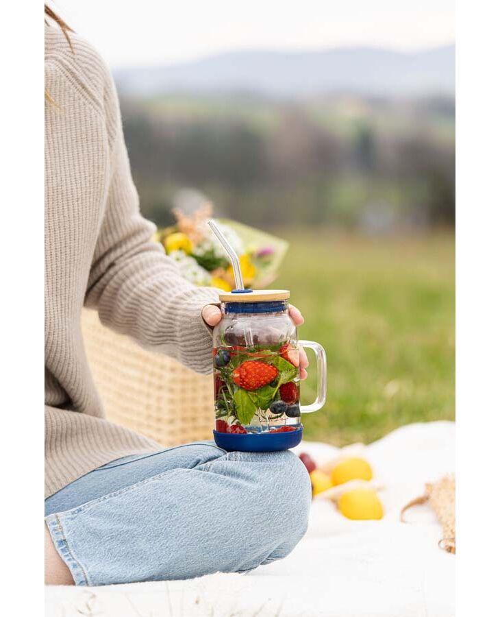Ръчно изработен буркан Fuori с капак и сламка с вместимост 600 мл - идеален за сервиране на всякакви освежаващи напитки, коктейли, напитки, вкусни сокове и смутита. Перфектен за пикник, тераса, градина, парти или барбекю на открито. Бамбуковият капак с дупка за сламка идеално ще предпази напитката от досадни насекоми и ще предотврати разливането на съдържанието. Бурканът има силиконово уплътнение, което предпазва съдържанието от разливане. Бурканът е изработен от боросиликатно стъкло, което го прави устойчив на резки температурни промени, което е важно при пълнене и измиване на съда. Продуктът разполага с удобна голяма дръжка, която улеснява пренасянето на съда.Долната част на буркана Fuori е поставена върху пластмасово основа, което значително подобрява стабилността и комфорта при използване на съда.