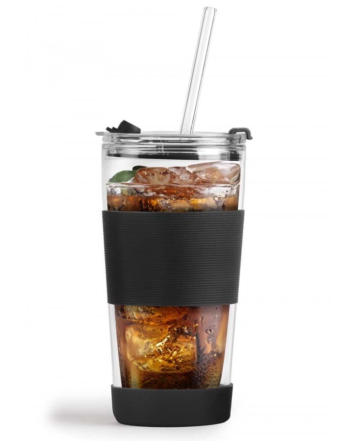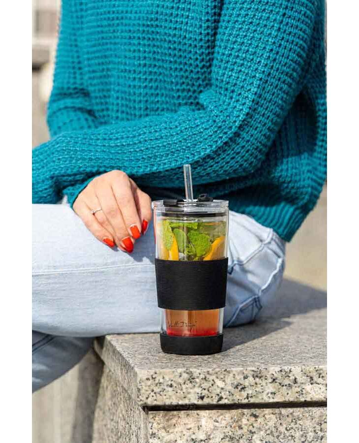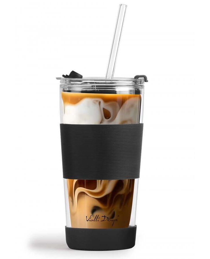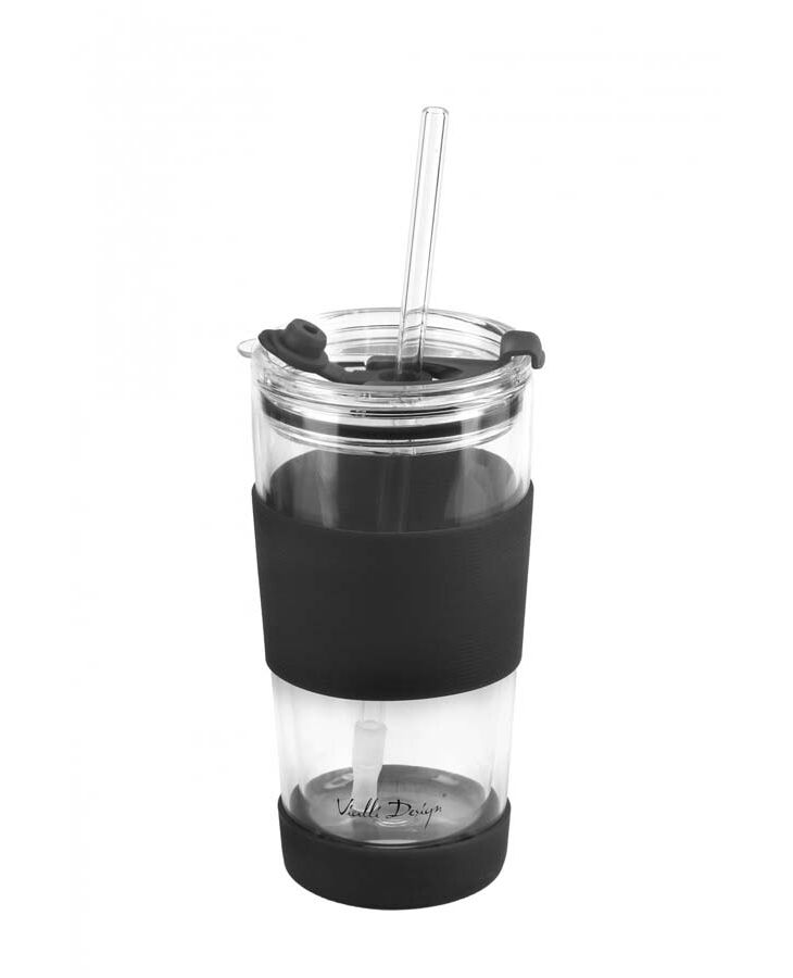 Термо чаша със сламка от серията Fuori на Vialli Design Ръчно изработената чаша от боросиликатно стъкло Fuori с вместимост 600 мл е с модерна и ергономична форма, а нейните термичноизолационни свойства гарантират, че напитката остава с желаната температура за по-дълго време. Дизайнът на чашата със силиконова обвивка предпазва ръцете от топлина или студ, така че да се насладите на безопасна дегустация на любимата си напитка. Също така чашата приляга стабилно в ръката ви, а допълнителното противоплъзгащо покритие на основата повишава стабилността ѝ. Чашата има два варианта за употреба, в зависимост от предпочитанията ви можете да използвате централния отвор и сламка или да пиете директно от чашата, като използвате втория отвор. Стъклената сламка със силиконов накрайник прави пиенето изключително удобно. Стегнатият капак с дупка за сламка идеално ще предпази напитката от навлизане на досадни насекоми и ще предотврати разливането на съдържанието. Чашата е перфектна за безопасно пиене на всякакви горещи напитки като кафе или чай. Също така идеална за сервиране на освежаващи напитки, коктейли, вкусни сокове или смутита, особено в горещите дни. Перфектна за пикник, тераса, градина, парти или барбекю на открито.