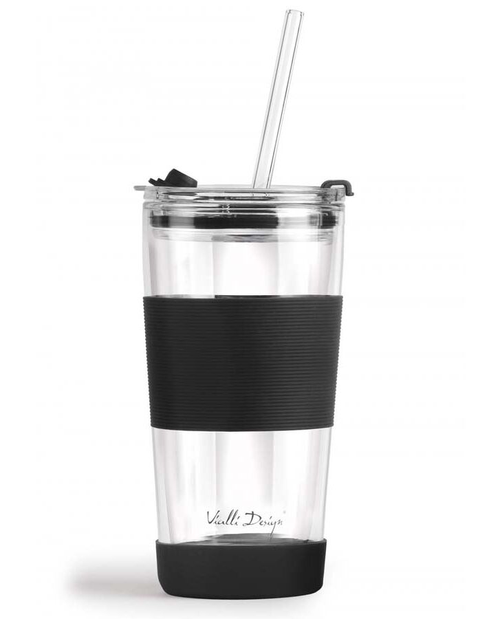 Двустенна чаша със сламка Vialli Design Fuori 600 мл с капак черна