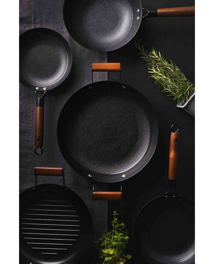 Запознайте се с новата серията на Masterpro - Odin, която ви дава всички предимства на чугунените съдове за готвене, като в същото време няма някои от техните недостатъци, като високото тегло например. Съдовете от серията Odin са произведени от пресовано желязо, което като материал е с около 50% по-леко от лятият чугун, но също като него има чудесни качества по отношение на задържането и разпределението на топлината. Подобни съдове са често срещан избор при професионалните готвачи тъй като материалът е невероятно издръжлив, също като чугуна.Чугунът е уязвим на ръжда и за да придобие незалепващи свойства трябва периодично да се омазнява и изпича. При съдовете от серията Odin това не е необходимо. Те са оборудвани с керамично незалепващо покритие CERA+, което не съдържа PFOA и PTFE и позволява здравословно готвене с минимално количество мазнина.Съдове от серията имат дръжки от акация, красива дървесина с естествени антибактериални свойства.Подходящи са за готвене на всички източници на топлина.