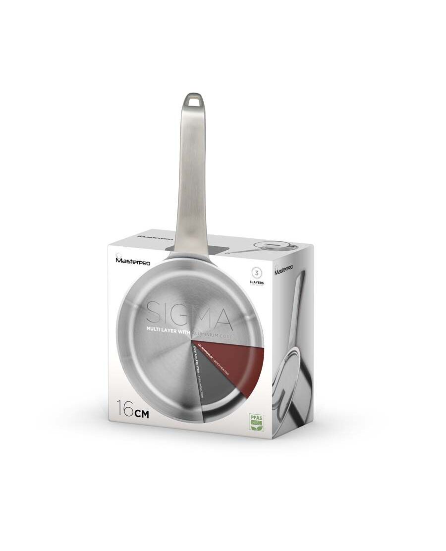 С Masterpro Sigma касерола 16 см / 1.6 л получавате комбинация от професионално качество, функционалност и модерен дизайн, идеална за приготвяне на сосове, кремове, зърнени и малки порции.