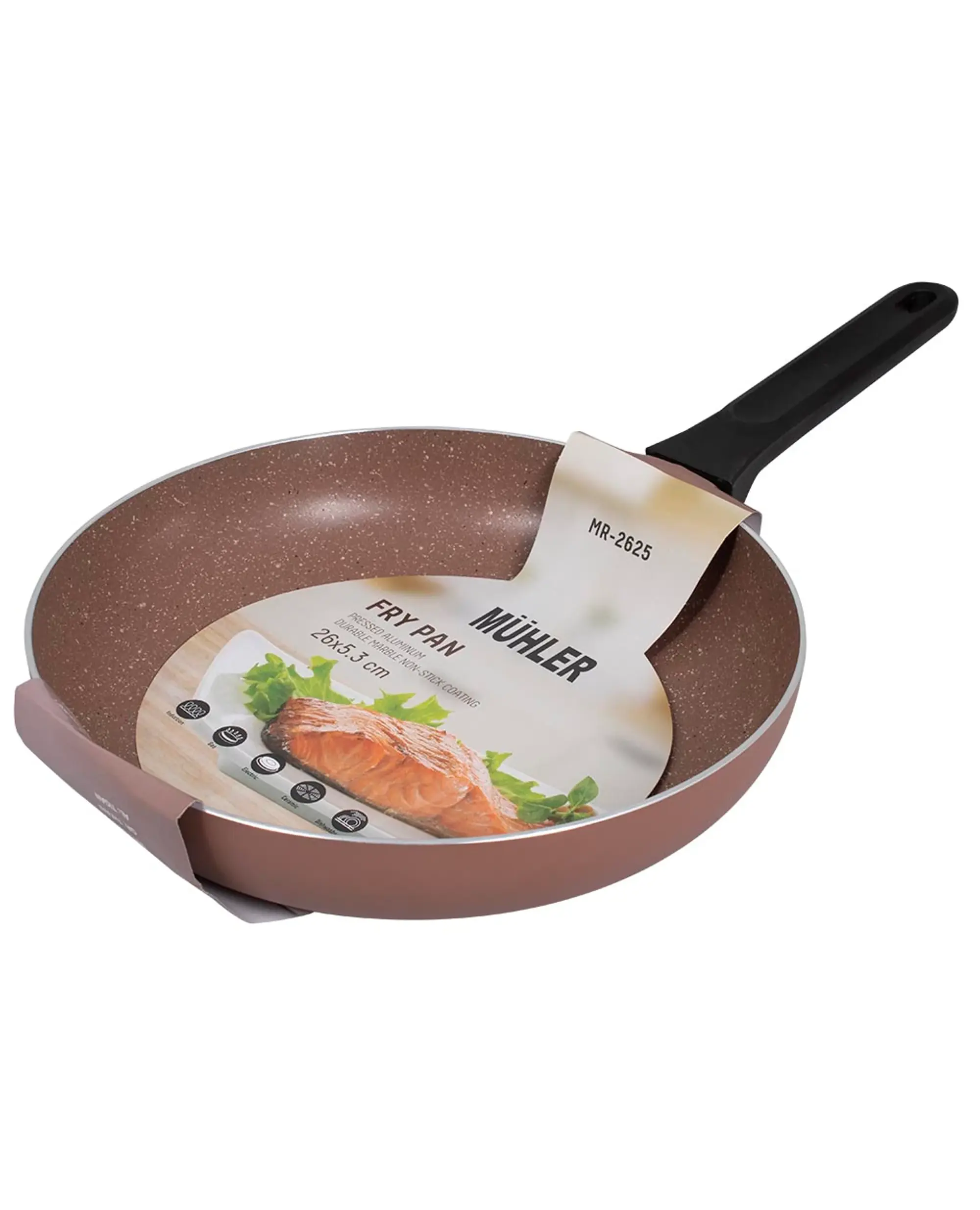Тиганът Muhler Kikka 26 x 5.3 cm е практичен и надежден избор за ежедневно готвене, съчетаващ висококачествен пресован алуминий и незалепващо покритие с мраморен ефект. Осигурява равномерно нагряване и отличен контрол при приготвяне на различни ястия – от яйца и зеленчуци до месо и риба.