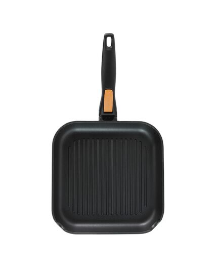 Масивен грил тиган със сваляща се дръжка. Предназначен за приготвяне на храна на готварска печка и във фурна. С незалепващо покритие и дъно от неръждаема стомана. Подходящ за всички видове котлони, включително индукционни, и всички видове фурни - газови, електрически и конвекционални. Размери: 26x26cmМахащата се дръжка го прави удобен за съхранение.