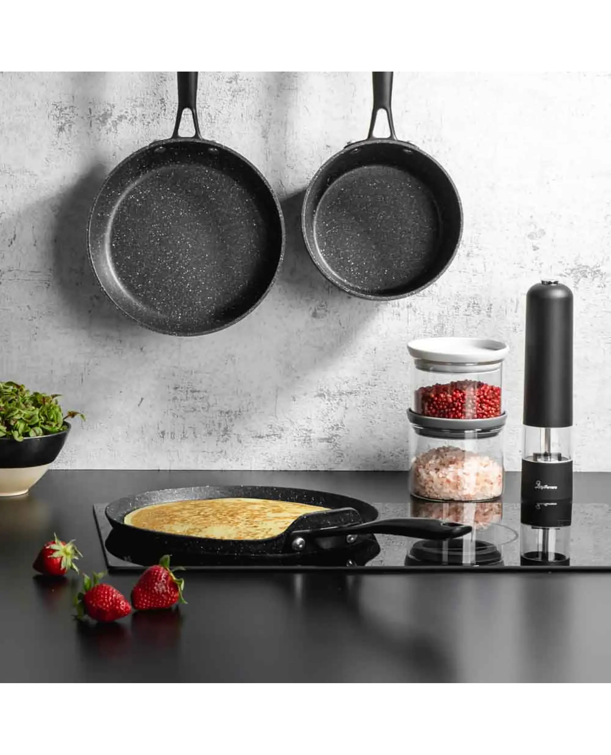 Дръжка от неръждаема стомана с PVD покритие в черно – осигурява удобен и стабилен захват, придава елегантен и модерен вид.