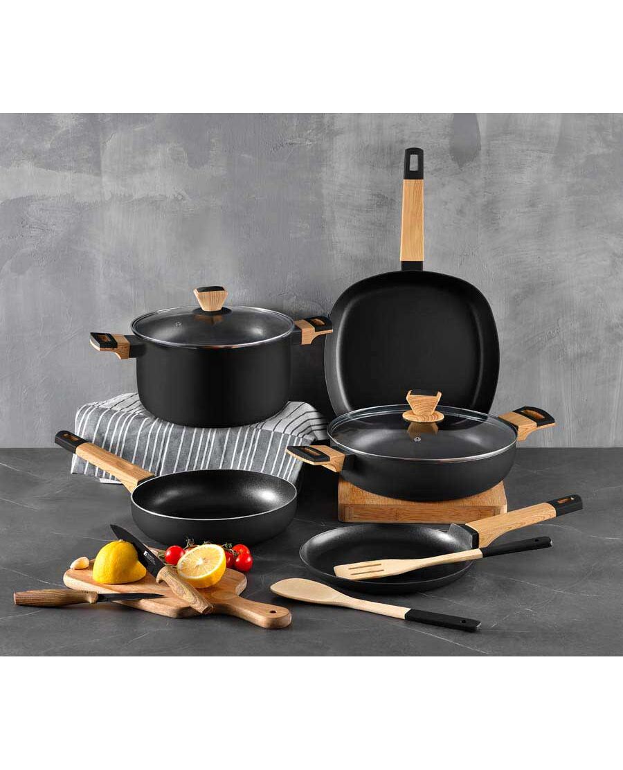 Издигнете кулинарните си умения на следващото ниво с пълната гама за тенджери и тигани на Bergner Earth Black. Earth Black е новата екологична колекция на Bergner. С дизайн и естетика, вдъхновени от природата, частите от колекцията Earth Black са произведени от устойчиви и 100% рециклируеми материали, без токсични вещества, като по този начин допринасят за намаляване на емисиите на CO2. Тенджерите и тиганите са изработена от пресован алуминий, което позволява бързо нагряване, като същевременно ефективно разпределя топлината в съда.Оборудвани са с с ергономични топлоустойчиви и меки на допир дръжки.Незалепващото покритие ILAG, без PFOA, олово и кадмий, ги прави здравословен избор за готвене, също така лесени за почистване и поддръжка. Подходящи са за всички видове котлони, включително индукционни.