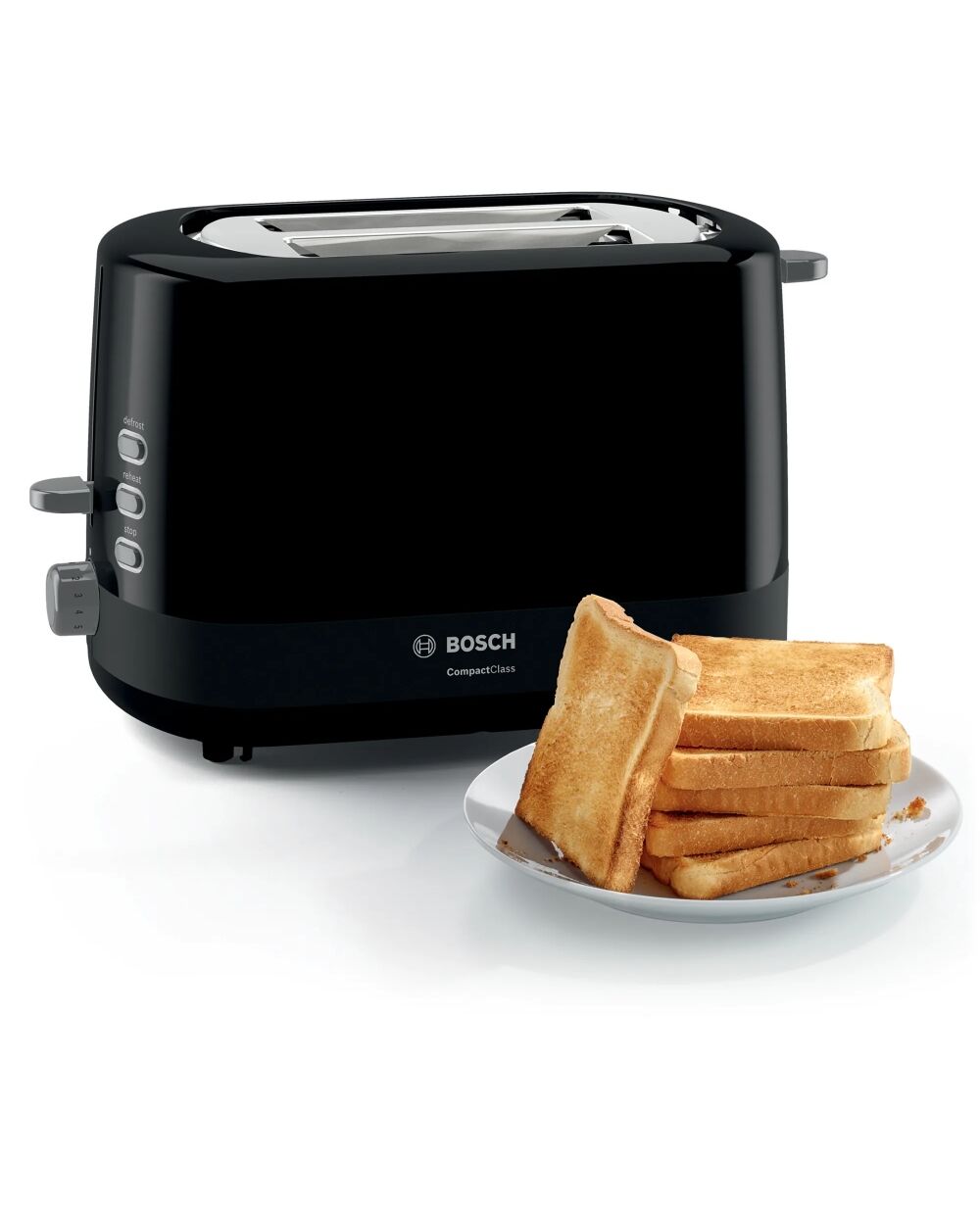 С функцията за автоматично изключване Тостерът Bosch CompactClass Black спира, когато хлябът се заклещи, предоставяйки ви несравнен комфорт и безопасност при приготвянето на закуска.