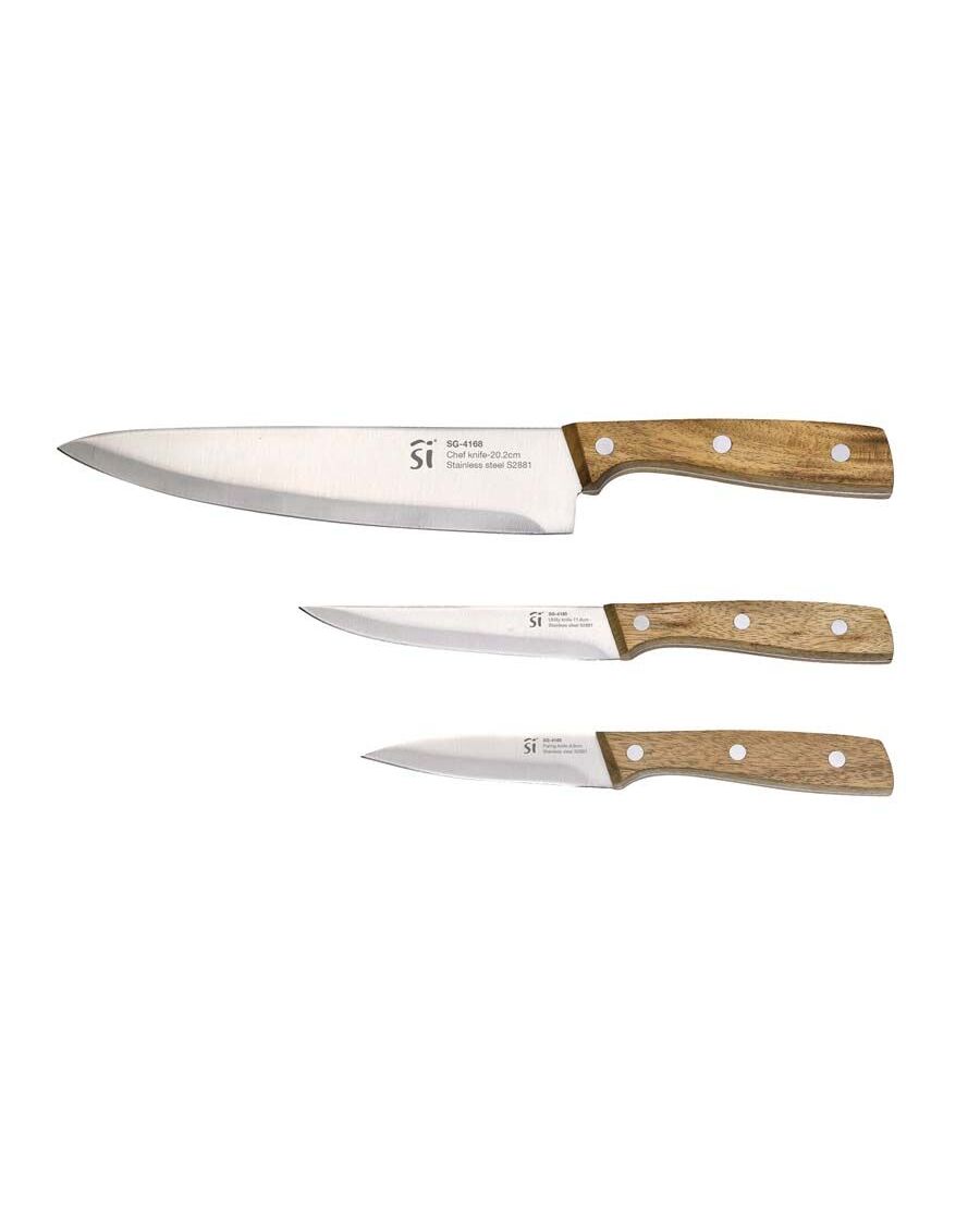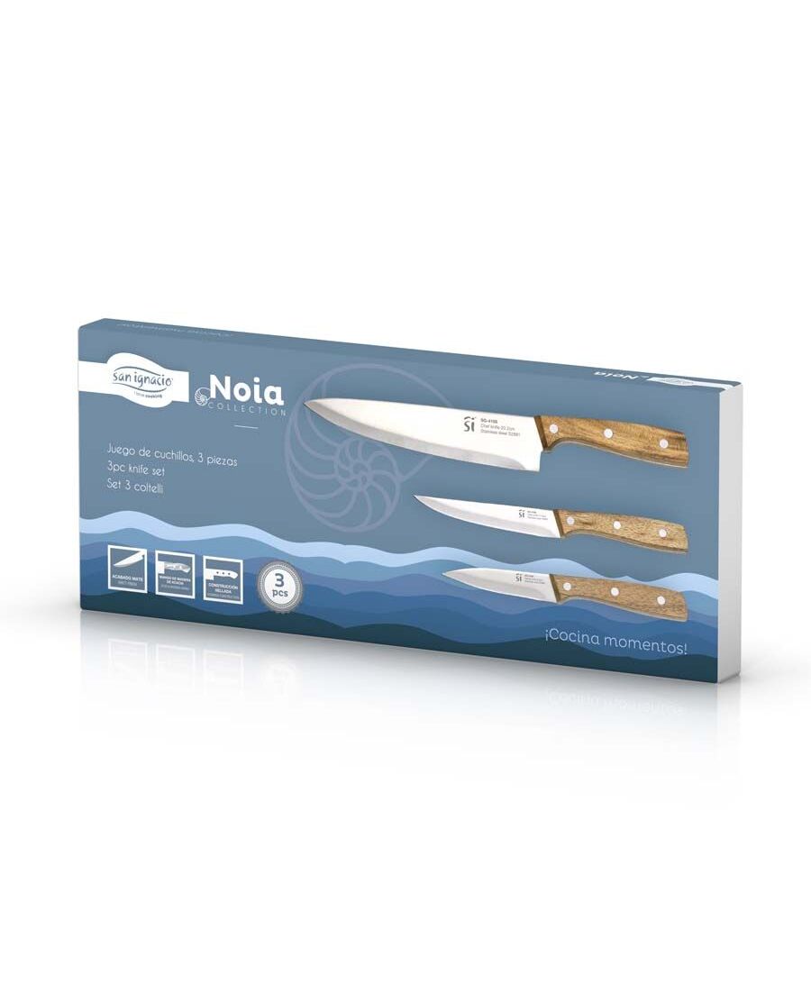 Комплектът Bergner Noia включва 3 висококачествени ножа, изработени от неръждаема стомана, които осигуряват прецизно рязане, дълготрайна острота и устойчивост на корозия. Всеки нож е оборудван с дръжка от естествена акациева дървесина, закрепена с метални нитове, което гарантира стабилен, удобен и сигурен захват по време на работа.