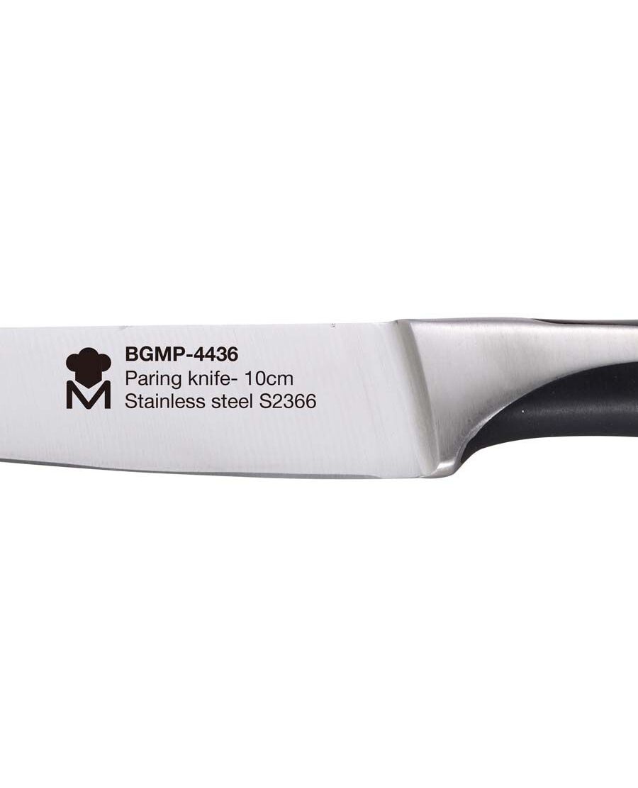 Малкият нож за белене Masterpro Elegance 10 см е създаден за максимална прецизност и удобство при подготовката на плодове и зеленчуци. Благодарение на острия си връх и висококачествената неръждаема стомана, той е незаменим помощник за всяка кухня – от ежедневното готвене до финото оформяне на детайли в ястията.