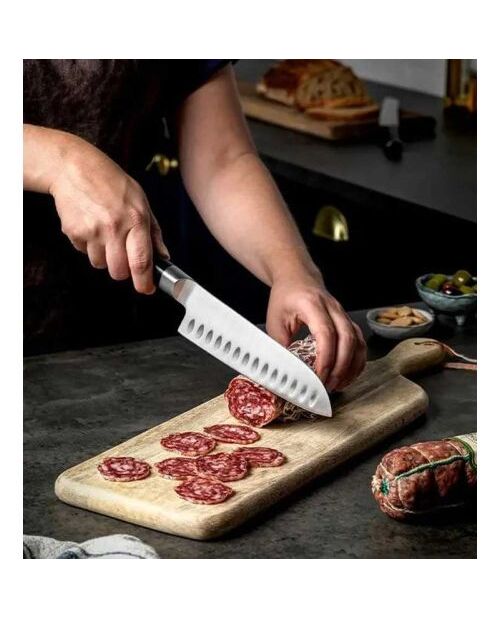 Острието е изработено от висококачествена неръждаема стомана X50 XCrMoV15, известна със своята устойчивост на корозия, петна и деформации. Специално проектираните вдлъбнатини (grantons) по острието предотвратяват залепването на храната и улесняват рязането.