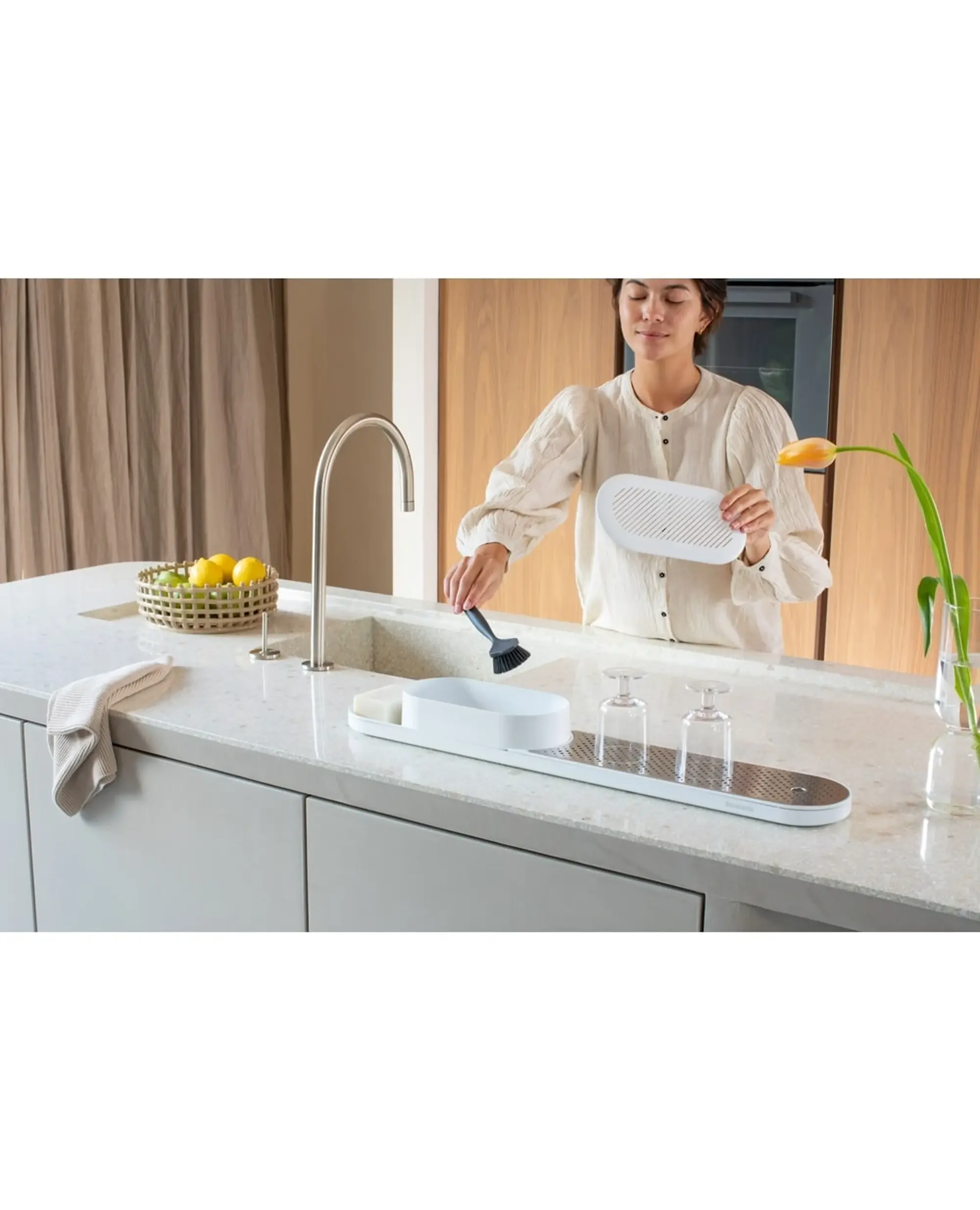 С комплекта за мивка Brabantia SinkStyle Mineral Fresh White поддържате чист и организиран кухненски плот, като всички необходими аксесоари са на една ръка разстояние. Този елегантен двукомпонентен комплект предлага пълно решение за съхранение, отцеждане и сушене — интелигентно съчетание между стил и практичност от марката Brabantia.