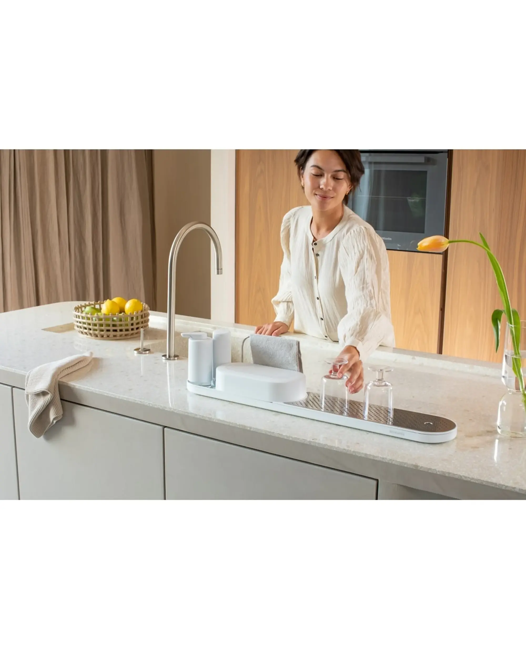 Комплектът разполага с отделение за отцеждане на чаши и чинии, оборудвано с неръждаема перфорирана решетка, която се сваля лесно за почистване. Благодарение на подноса за събиране на вода, плотът остава винаги сух и защитен, а противоплъзгащата се основа предотвратява движения и надраскване.