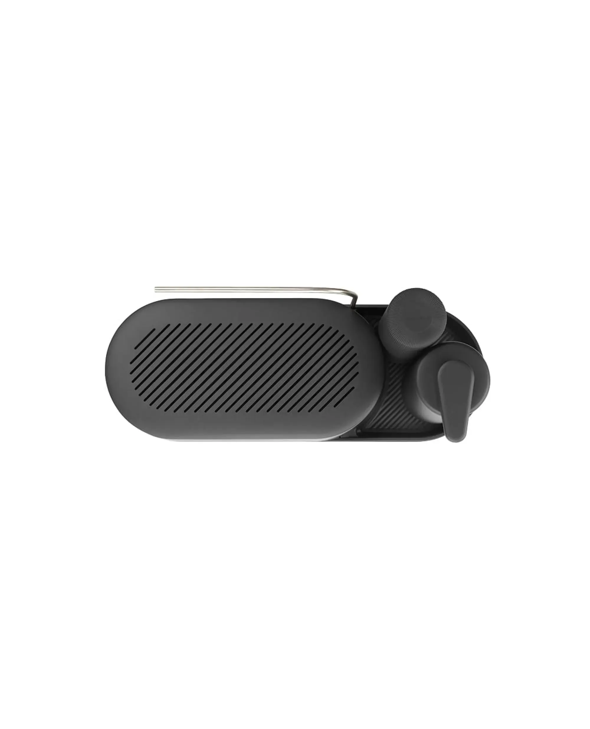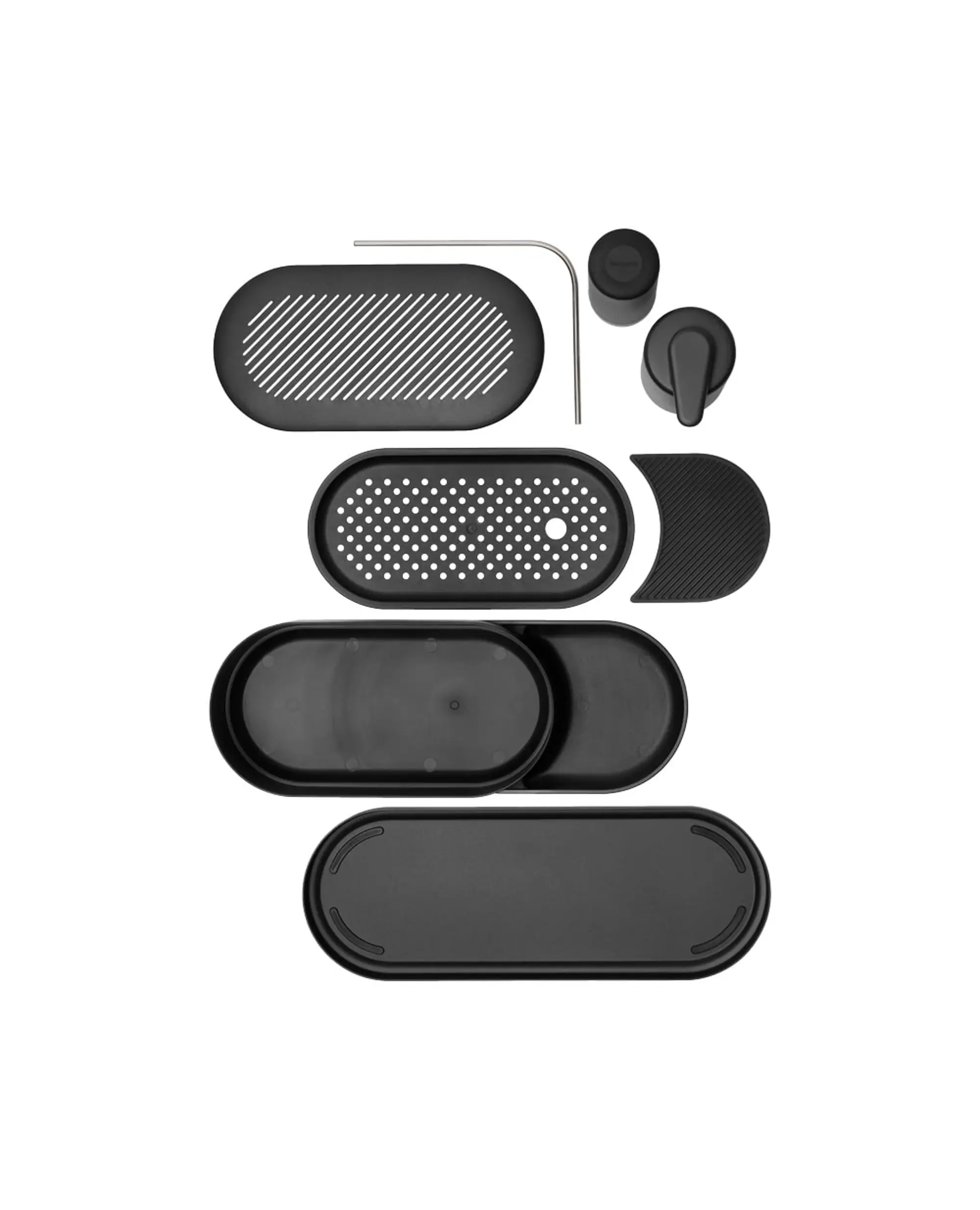 Има и приставка за сушене на кърпи, както и поднос за отцеждане, който задържа водата и поддържа плота сух. Всички елементи се разглобяват лесно, което прави почистването бързо и удобно. Основата е противоплъзгаща се, предпазвайки плота от надраскване.