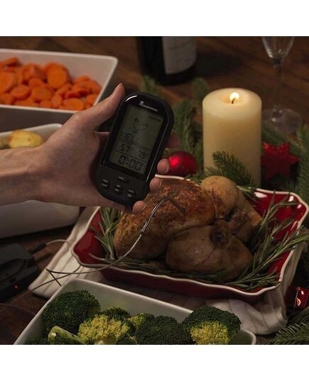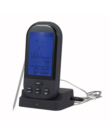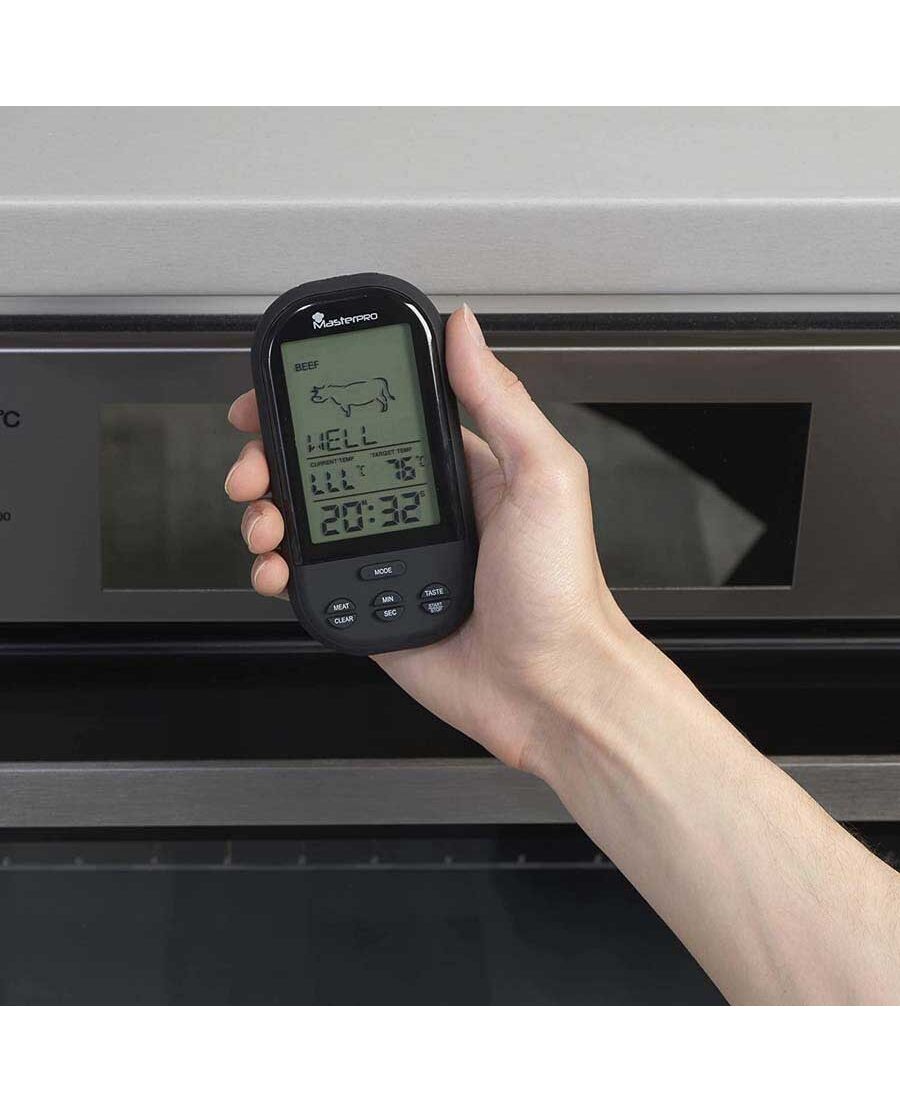 Дигитален термометър Masterpro Foodies - идеален за оптимално готвене на месо. Този термометър е безценен аксесоар за всеки опитен или любител готвач. Има 8 настройки за различните видове месо, (агнешко, пилешко, пуешко, телешко, говеждо, свинско, риба, хамбургер) за да се гарантира, че те винаги са приготвени до съвършенство. Просто поставете сондата от неръждаема стомана в месото и използвайте LCD дисплея, за да проверите температурата, докато таймерът и звуковата аларма ви уведомяват, че желаната температура е достигната. - Захранване: 2 броя батерии ААА- Безжично измерване на температурата на храната- Дисплей на таймера- Таймер- Таймерът може да отброява до 99:59 минути- Функция тип месо и ниво на готвене- Функция подсветка- °C/F° избор на мерна единица- Работен температурен диапазон: 0°C-250°C/ 32°F-500°F- Безжично измерване на температурата на храната- Обхват на радиочестотно предаване: 30 метра