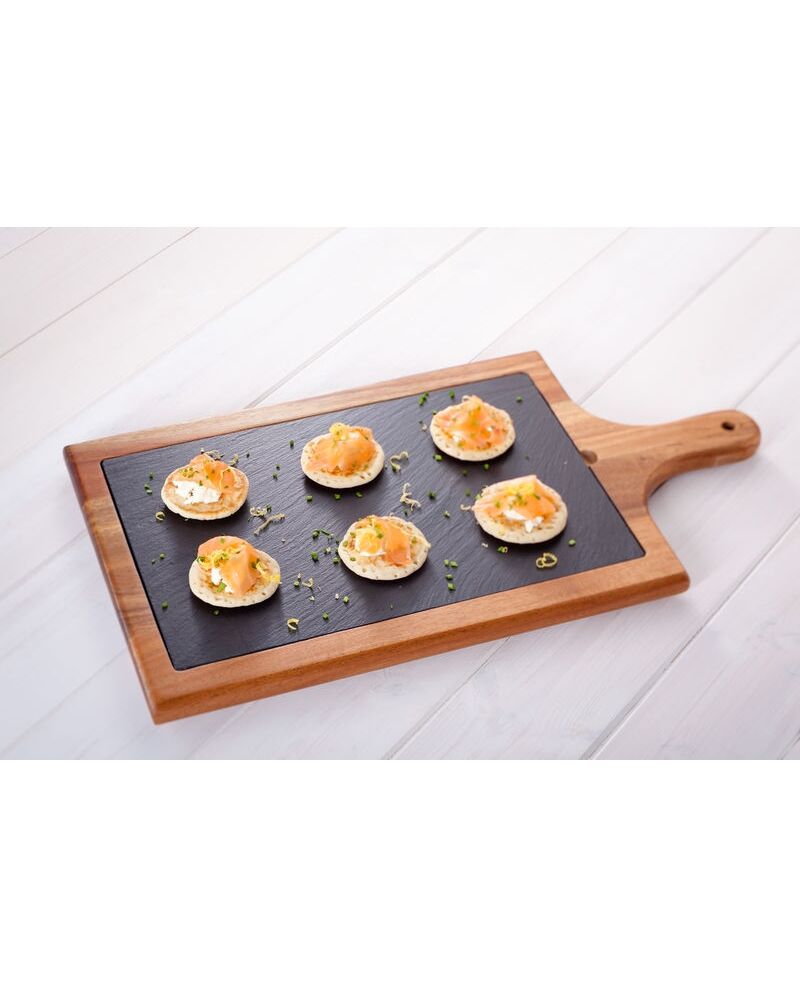 Дъската за сервиране на английската марка Judge е красиво допълнение към всяка изискана трапеза. Изработена е от естествено акациево дърво и черен камък шисти. Подходяща е за сервиране на сирена, деликатеси, антипасти, мезета, десерти и др.За по-голямо улеснение, каменната част от платото може да бъде извадена и почистена с лекота. Дъската е във правоъгълна форма с дръжка Размери 45 х 25 см