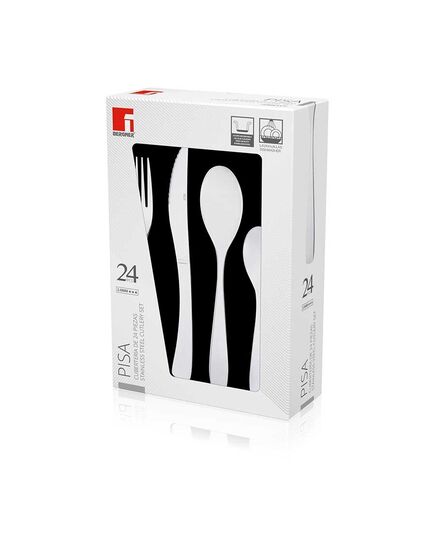 Приборите за хранене на Bergner Pisa са изработени от висококачествена неръждаема стомана, която се почиства лесно и издържа дълго време. С класическия си и eлегантен дизайн, те са подходящи както за ежедневна употреба, така и за гости. Комплектът съдържа 24 прибора за хранене: - 6 броя основни вилици- 6 броя основни ножа- 6 броя основни лъжици- 6 броя чаени лъжички Дебелина: 2 мм
