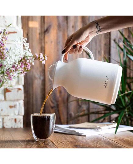 Термокана със стъклена вложка с вместимост 1 литър от серията Amo на Vialli Design. Практична и функционална кана, която е идеална за бизнес срещи или семейни тържества. Вътре в каната има стъклена вакуумна изолация, която гарантира поддържане на правилната температура до 24 часа, както за студени, така и за топли напитки. Стените на каната не се нагряват при съхранение на горещи течности в нея и не кондензират при съхранение на охладени течности. Най-високото качество на материалите използвани за производството на термоса. Удобната дръжка на каната, профилираният чучур, винтовият капак с дръжка и ниското тегло я правят изключително удобна за използване. Класическото бяло ще се слее грациозно с всеки интериор. Производителят не препоръчва почистване в съдомиялна машина.