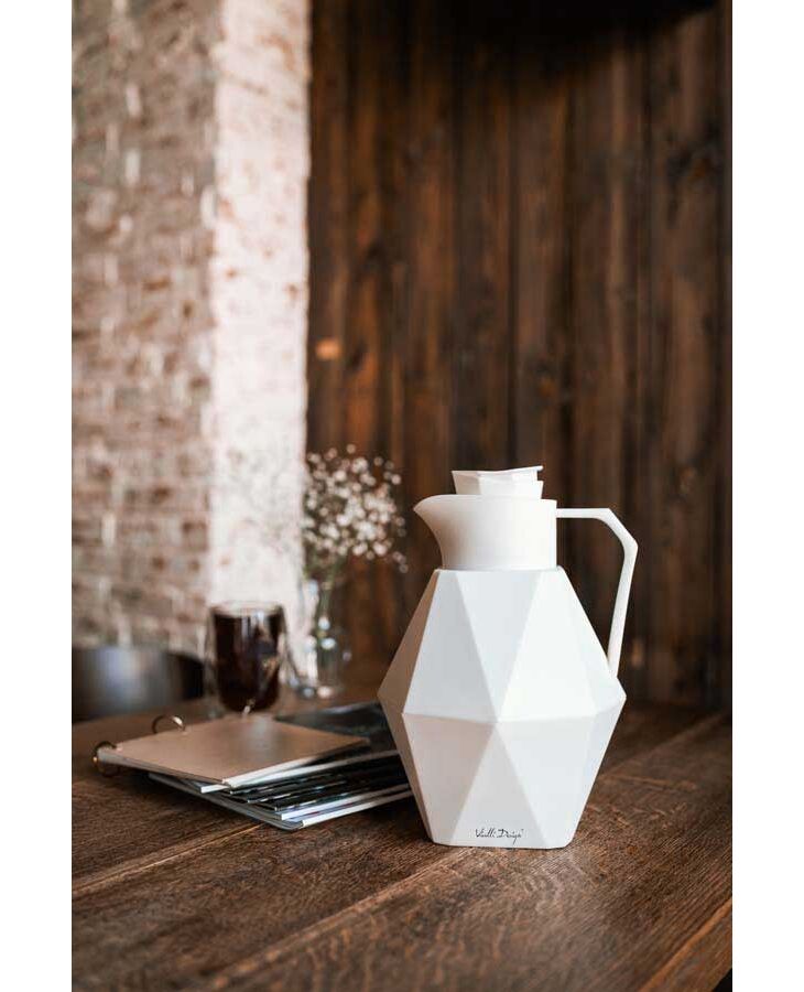 Ако сте любител на чая или кафето знаете колко е неприятно напитките да изстиват твърде бързо. Термо каната от колекцията Geo на Vialli Design е страхотно предложение за всеки, който прекарва зимните вечери с книга и запас от любимия си чай. Тя е идеална и за по-големи събирания, конференции или бизнес срещи.Каната е с ръбести геометрични форми, което я прави много елегантна и модерна. Корпусът е изработен от висококачествена пластмаса, а вътрешната част е от стъкло, благодарение на което поддържа температурата до 24 часа. Каната е изключително лека и лесна за работа. Освен това изглежда интересно с модерния си и леко футуристичен дизайн.