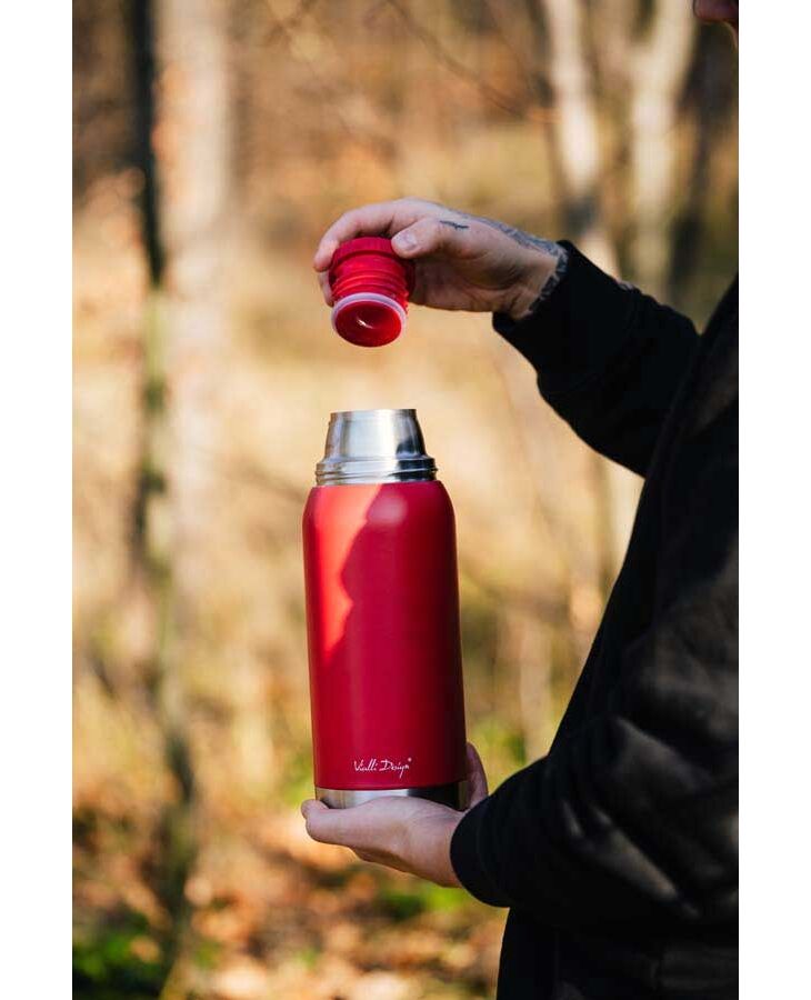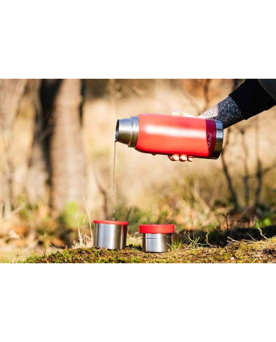 Термосът за пътуване от серията Fuori е изключително практичен и удобен продукт, отличаващ се с голям капацитет - до 1000 мл. Основното му предимство е стоманената вакуумна изолация, благодарение на която напитките поддържат температурата си до 16 часа. Термосът се справя еднакво добре както с горещ чай през зимата, така и със студен сок или чай в горещите дни. Външната част на термоса не се нагрява и върху него не се появява конденз, независимо от съдържанието му. Използването на висококачествени материали осигурява 100% херметичност и по време на пътуване термосът може да бъде поставен свободно навсякъде без риск от разлив на течност. Продуктът се отличава с модерен дизайн, удобна форма и висока сигурност – подобна комбинация гарантира удовлетвореността на всеки клиент. Термосът е оборудван допълнително с две чаши с вместимост 150 мл и 200 мл. Характеристики на термоса: Стоманена (18/8) вакуумна изолация, осигуряваща максимално поддържане на подходящата температура за топли напитки до 12 часа и студени напитки до 16 часа Модерен дизайн Удобен за държане Лек, компактен и лесен за транспортиране и съхранение Разполага с две чаши с вместимост 150 мл и 200 мл Външната част не се нагрява от топли храни и не кондензира от студени Идеален за употреба на работа и пътуване 100% устойчив срещу протичане