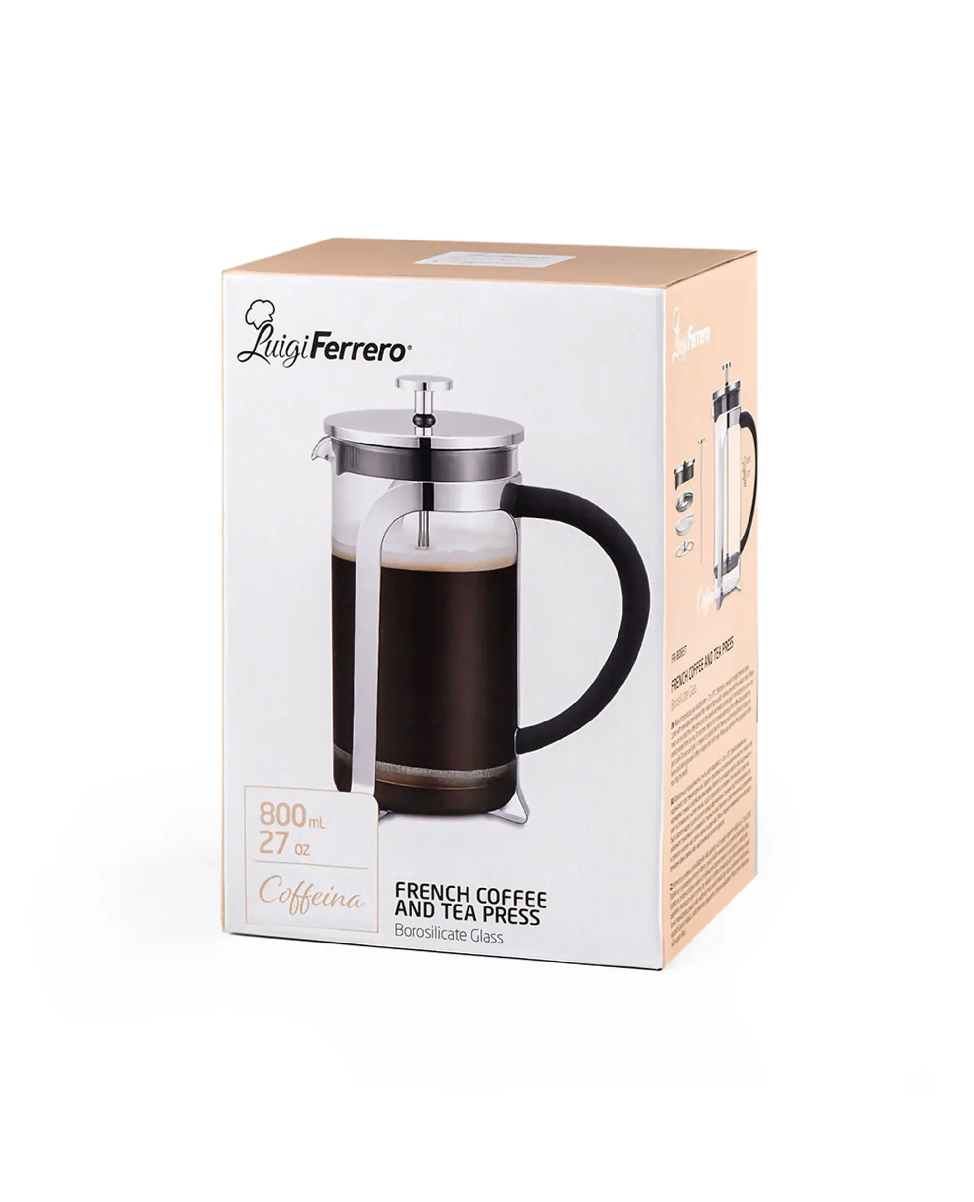 Френската преса Luigi Ferrero Coffeina 800 ml е перфектното решение за любителите на ароматно, прясно смляно кафе и насипен чай. Съчетава стилен дизайн, здравина и функционалност, за да осигури богат вкус и отлично извличане на ароматите при всяко приготвяне.